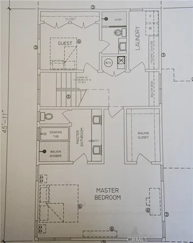 Downstairs, the layout includes a primary suite and guest bedroom, each with en suite baths. The primary bath features a soaking tub, walk-in shower, and double vanities; the guest bath includes a shower and single vanity. Bedroom separation by the central staircase enhances privacy.