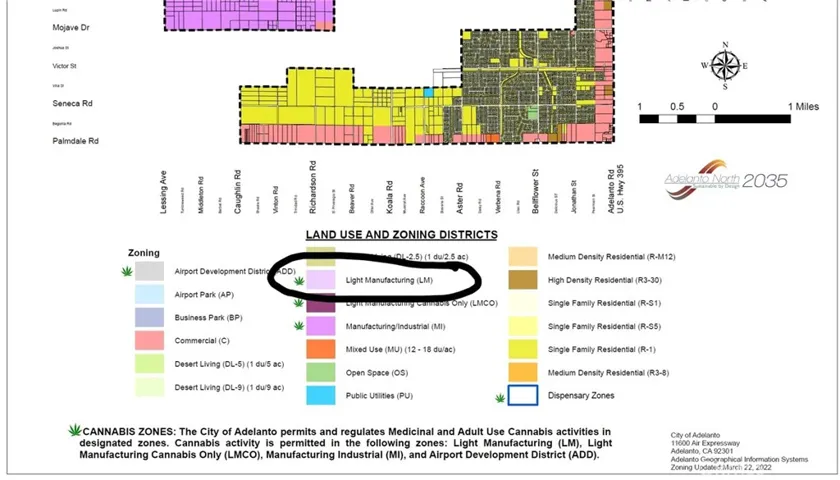 PRIME 8+ acres (2 lots) lot zoned Light Manufacturing (LM) for Cannabis CULTIVATION and PROCESSING. Significant building and warehousing activity in the area. Cannabis lots a couple hundred yards away expecting to receive CUP (Conditional Use Permits) and building permits shortly. Located at NW Corner of Aster and Daisy – 2 hundred yards East of Aster. Ready for Entitlement NOW, or Buy and Hold for potential upside. In the Path of Future Development. There are two 4.2 acre lots (APN 0459113320000 and 0459113330000). Prefer selling both lots together. CANNABIS ZONES: The City of Adelanto permits and regulates Medicinal and Adult Use Cannabis activities indesignated zones. Cannabis activity is permitted in the following zones: Light Manufacturing (LM), Light Manufacturing Cannabis Only (LMCO), Manufacturing Industrial (MI), and Airport Development District (ADD). Please contact City of Adelanto Planning for any specific info.