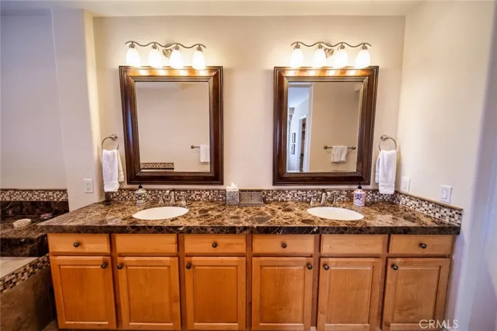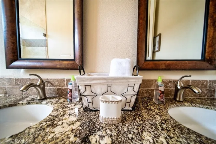 Retreat to the serene primary bedroom suite, featuring a sizable walk-in closet and an en suite bathroom with dual sinks, a soaking tub, and a separate shower. Two additional well-appointed bedrooms with ensuite updated bathrooms, while the fourth bedroom offers versatility with full-sized bunk beds and a convenient desk area.
