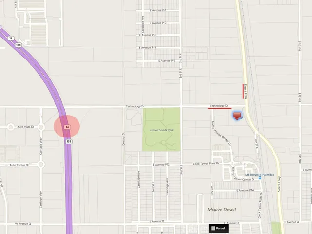 2.14+/-Acre SW of Sierra Hwy. and paved Ave. P-8 (Technology Drive), Zoning is Plan Development Industrial property (PDM1) All utilities in the Street. It is just across the street from Palmdale’s new transportation center. Fwy. 14 just 1/2 mile to the west. Trade & Commerce Center just west of Fwy. 14. Winnell Industrial center 300′ north of the subject property. The Palmdale Air Terminal is just 3.5 miles to the east. Palmdale carries the nickname of “aerospace capital of the United States”, which has been the home for research, development, and testing of several important aircraft. Palmdale is home to Lockheed Martin, Boeing, NASA, Northrup Grumman, and Air Force Plant 42. Several other manufacturing users have relocated to Palmdale seeking cheaper land alternatives to Los Angeles as well as taking advantage of various tax incentives. This movement, along with the continued growth of the residential population solidifies Palmdale as an attractive long-term investment.