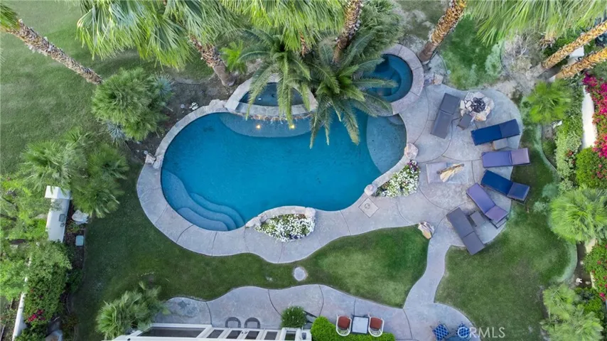 For added enjoyment, there’s a large pool with waterfalls and LED lights, a spa with a golf course view, sun lounging chairs, a full BBQ grill with a sink, and an exterior shower and bathroom with a bar for entertaining guests. The living room showcases floor-to-ceiling windows with breathtaking views of PGA West’s golf course.