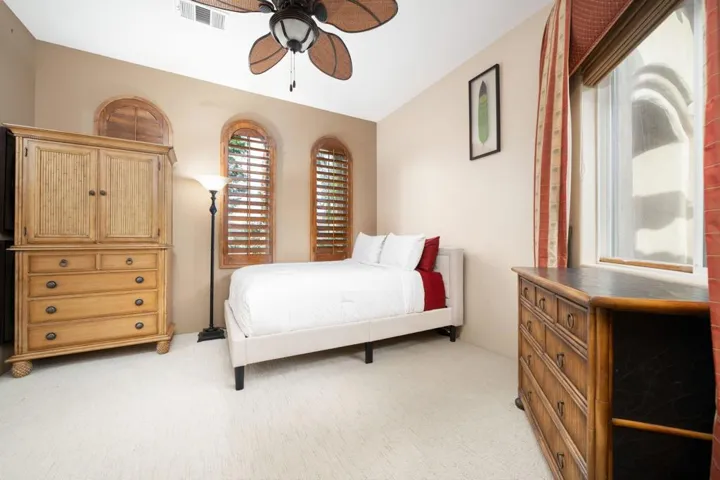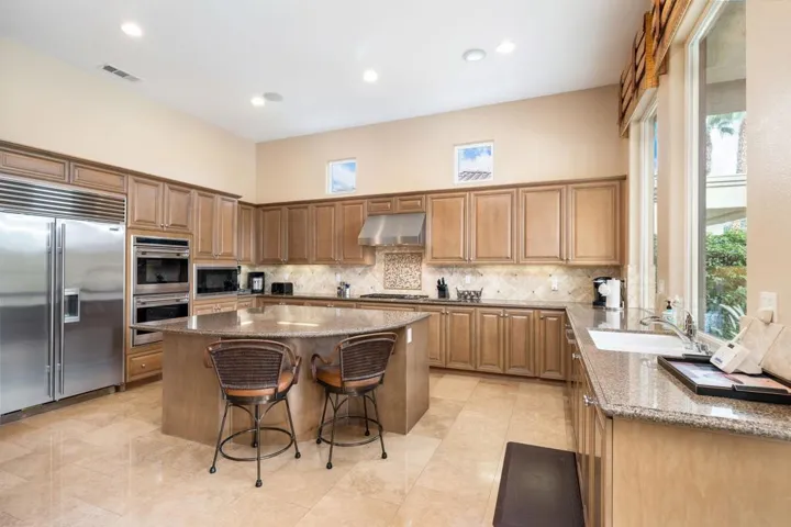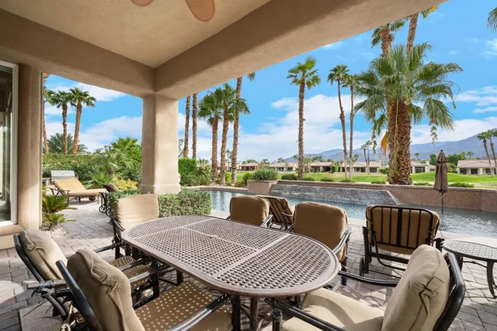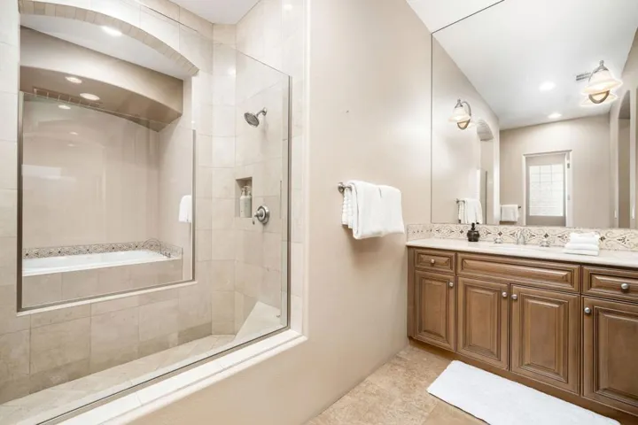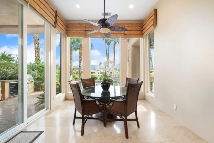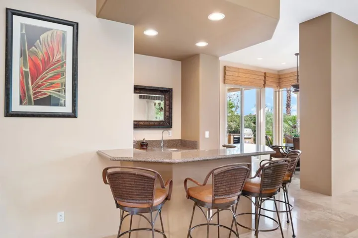 Magnificent panoramic southern mountain views and a perfect view of the Nicklaus Tournament Golf Course 17th green offers the perfect backdrop for this 4 bedroom, 3.5 bath spacious Eagle Bend Plan 3 home!! Private gated entry landscaped courtyard with pavers. Many upgrades throughout with Wolf, Bosch & Sub-Zero Stainless-Steel appliances, upgraded cabinets, wet-bar, granite countertops in kitchen including stunning mosiac listelle trim. Floors are a beautiful Noce’ Travertine Stone w/ special Mosaic Medallion which provides a dramatic entry. Sauna in the primary bath. Surround sound speakers in main areas & patio. The resort style pool is over 50 ft. and includes a tanning shelf, lovely waterfall feature & spa, and a fireplace.Rate varies by month, summer and shoulder seasons have lower rates. Please inquire with listing office.