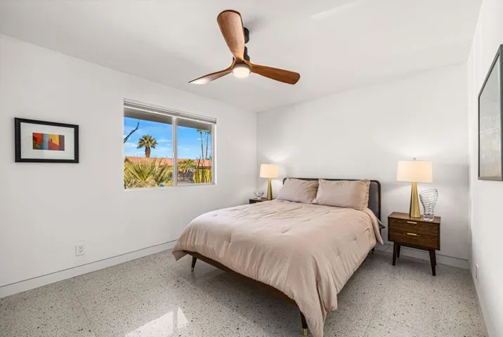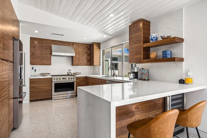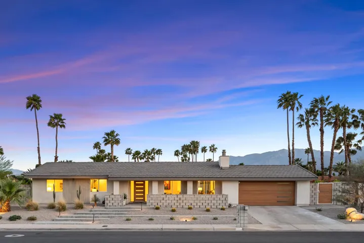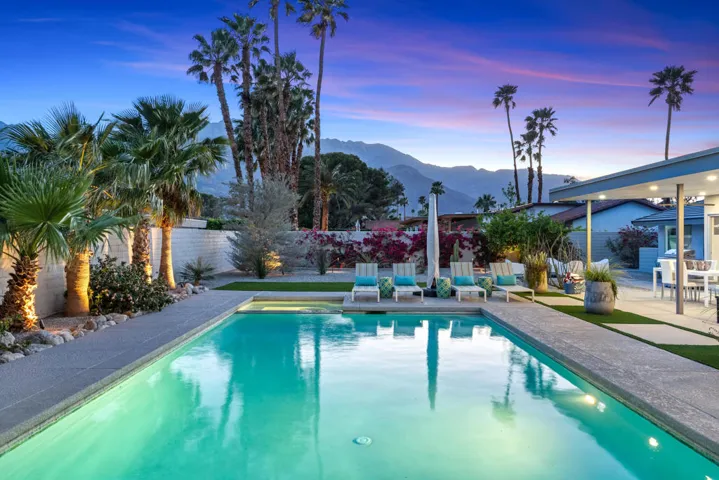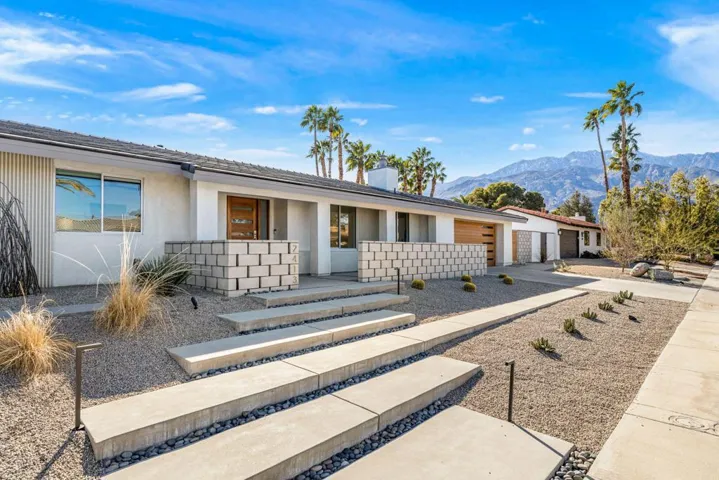 This sophisticated architectural standout was reimagined and completed in 2023 by award-winning architect Charles Austin of Configure 8 Studio. The 3-bedroom, 3-bathroom Palm Springs gem has 2300 SF of living space, which includes the newly added detached casita. The interiors & exteriors were meticulously reconstructed with an emphasis on the stunning views of the San Jacinto & Santa Rosa mountains – large clearstory windows & industrial-grade custom doors were used throughout. Exquisite attention to detail and high-end finishes make this a contemporary masterpiece – oversized terrazzo flooring, quartz countertops with waterfall edge, custom walnut & maple cabinetry, wire-brushed hardwood flooring, high-end kitchen appliance package, custom-built walnut desk workstation in the den, handmade architectural interior doors, custom floor moldings, tongue & groove ceiling, custom lighting detail, mid-century breeze block patio wall in the front facade. Huge custom pool & spa with screen logic automation app. 55” smart TV in the primary bedroom, 75” smart TV in the casita living room, and additional TVs in the den and casita bedroom. Professionally staged and fully furnished, the house also has Nest smart thermostat & Alexa Eco speaker. Minutes from world-renowned restaurants, nightlife, art galleries, shopping, hiking, and golf! Come enjoy this quintessential Palm Springs getaway!