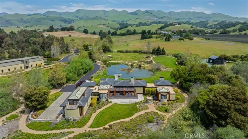 Nestled in the heart of Edna Valley wine country, this property unveils a captivating estate that seamlessly blends modern architecture living with tranquility. Ideal for car enthusiasts and perfect for entertaining, this sanctuary includes an ample 7,192 square-foot multi-use barn. A large koi pond gracing the front of the residence adds beauty and balance to the ecosystem and landscape. The use of natural materials, including native cut stone, copper, and western red cedar, contributes to the unique and distinctive aesthetic. The considerate use of copper roofs, trim, and copper-clad custom windows and doors provide longevity and durability. Enjoy this magnificent estate, where thoughtful design by NMA Architects extends to every corner, with opportunities for additional bedrooms within the confines of the home. Two one-bedroom en-suites, located in distinct wings of the home, offer both space and privacy. The exceptional kitchen is a masterpiece of design that offers versatile cooking options, including top-of-the-line stainless-clad appliances and a separate butler’s pantry. Complete with an artist’s dream studio/or more bedrooms, a sophisticated media den, and a screened-in porch overlooking the thriving koi pond. The oversized 4-car garage includes extra wide and deep garage bays, storage lockers, a temperature-controlled wine storage room, a Tesla high-speed charger, and an 86-panel solar system. The barn, with an architectural 35′ wood curved beam ceiling, currently houses the 3rd bedroom/office, wood shop, machine shop, service elevator lift, kitchen area, and ¾ bath. Enjoy the 10 acres of grounds, abundant with walking paths.