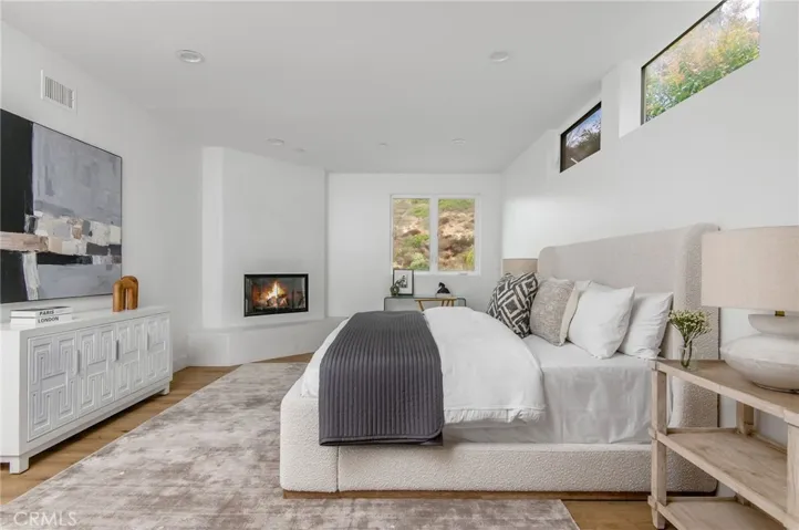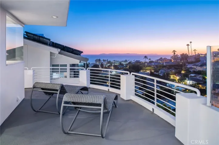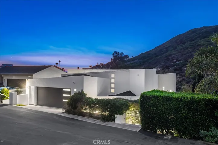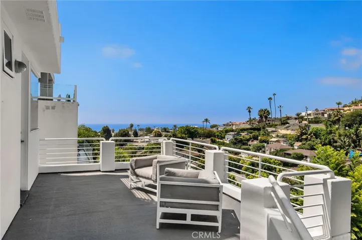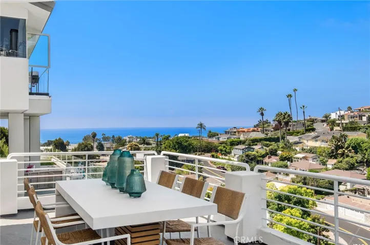 A stunning example of contemporary Laguna Beach architecture with panoramic views of the Pacific Ocean and the city below. This highly updated home spans approximately 4,256 square feet across four levels and features five bedrooms in addition to multiple outdoor spaces. The living space, dining area, and kitchen flow seamlessly to create a large, voluminous great room just off the main entryway. Multiple windows perfectly frame the ocean views and let in abundant light. The recently renovated kitchen features two-tone cabinetry, a suite of Bosch appliances, and a waterfall-edge marble island with a cooktop. A large patio off the living area allows for alfresco dining, while the fireplace with a modern concrete mantle anchors this airy space. The primary suite spans the entire top floor, with walls of Pacific-facing windows, a sizable balcony, and a massive walk-in closet. The remodeled owners’ bathroom is grand and features a standalone tub, a seamless dual shower, and floating vanities. Another of the home’s fireplaces rounds off this floor. All secondary bedrooms are located on lower levels, granting their occupants ultimate privacy. A junior suite with an adjacent five-piece bath and walk-in closet shares the floor with another of the home’s decks and two additional bedrooms connected by a jack-and-jill bathroom. The lowest level houses a large flex space with its own entrance, which lives like an ADU – with a kitchenette and a full bath. Dream location, with Laguna’s shopping, galleries, and famed beaches just minutes away.
