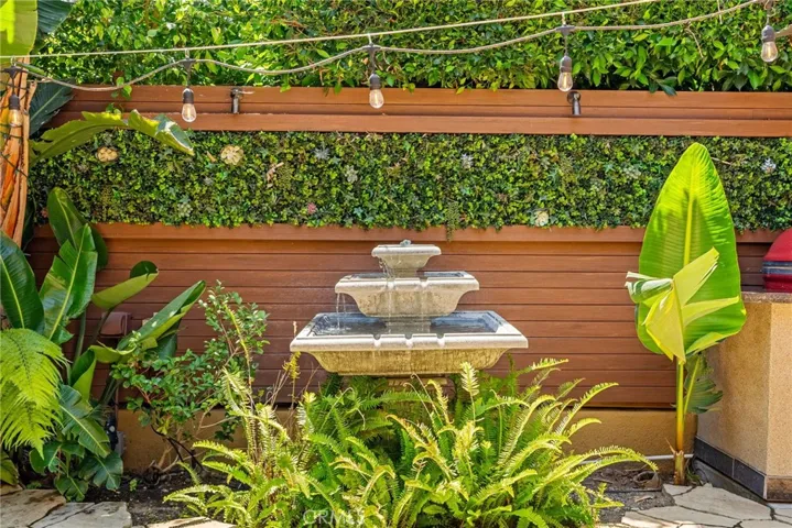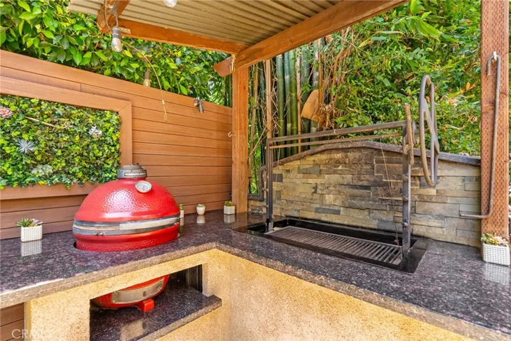 Double door opens out to newly updated a private garden patio features a Santa Maria grill and Kamado-style smoker, an outdoor fountain to enhance and makes garden feel serene and calming.