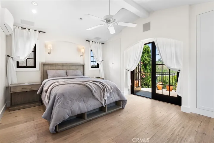 Upstairs bedroom updated with a built-in closet, Samsung TV, a direct access to a charming Juliet balcony with canyon views. Steamed shower, Jeeves classic towel warmer rack and heated flooring in the bathroom.