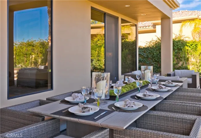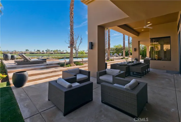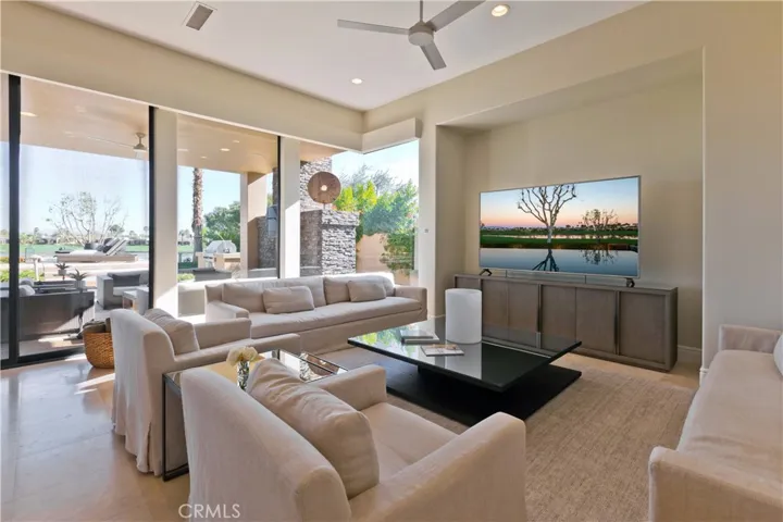 Venture outdoors to the 25,000 gallon infinity saltwater pool, spa with a cascading waterfall, this provides a spot to relax and enjoy the sunshine with numerous seating and lounging options. There is an outdoor family room, with seating for 8 with couches and chairs, 65″ TV and gas operated fireplace. The al fresco dining table seats 10 to enjoy the sunset. .