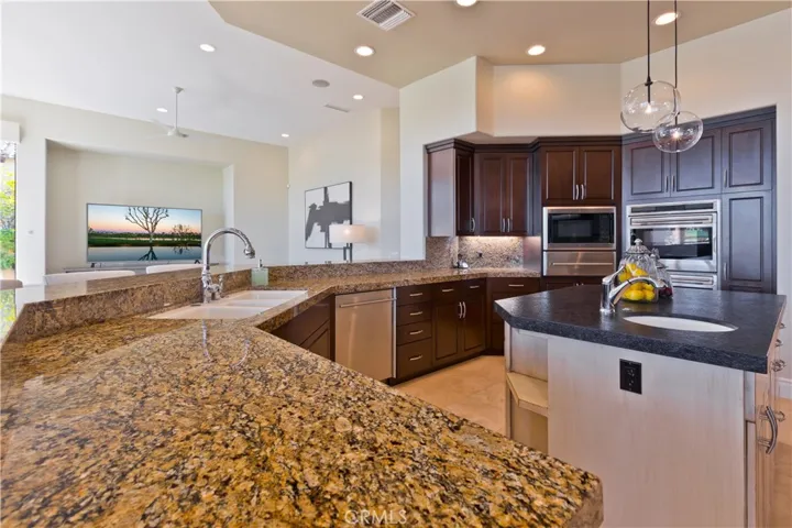 This property showcases the beautiful lake and mountain and golf course views which are framed by the over-sized, floor to ceiling windows and custom sliding glass doors. An open floor plan with 14″ ceilings, creates a sense of grandeur and warmth. The living room has a large 70” HDTV with floor to ceiling windows. Enjoy a dinner party in the formal dining room set for 8 with easy access to the bar and two refrigerated wine coolers or keep it casual at the kitchen dining table and counter bar with an additional seating for 10.. The gourmet chef’s kitchen is fully equipped for all your hosting needs with stainless steel Wolf appliances which include dual ovens, warming drawer, microwave, 5-burner gas cook top, 2 Bosche dishwashers and Sub-Zero refrigerator. Enjoy the large granite countertops and additional bar stool seating.