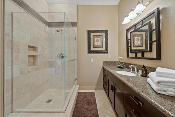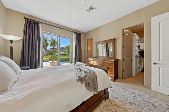 Welcome to the world-famous PGA West, featuring the exclusive Arnold Palmer Private golf course and its par 5 6th hole. This custom built, five bedroom, six-bathroom home is designed with luxury in mind, offering Travertine floors, high end appliances and spacious entertainment areas. Grand primary bedroom features 10′ patio door w/ access to back patio and an impressive primary bath on suite that has Travertine deck mounted soak tub along w/ full walk in shower. The walk in closet is incredible. The second bedroom offers a separate seating/TV/office area w/ dry bar that walks through to the bedroom area w/ walk full tile walk in shower & access to front courtyard via French patio doors. Bedrooms 3 & 4 have on suite baths making the entire home very functional. Bedroom 5 is special w/ bunk beds that can sleep 4, built in dresser/entertainment center w 70′ TV and area to play. Dont miss the game room that has 75′ wall mounted TV, plush oversized chairs, dart board and high top gaming table as well as patio door access to front courtyard via French patio doors. BREATHTAKING western mountain views highlight the impressive back yard w/ custom Pebble Tec pool/spa w/ built in swim up stools, putting green, Travertine tile patio and wonderful golf course views. Enjoy the built in custom barbecue w/ all the bells and whistles, granite top and custom high seating island. Very special home!!