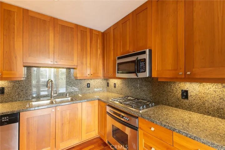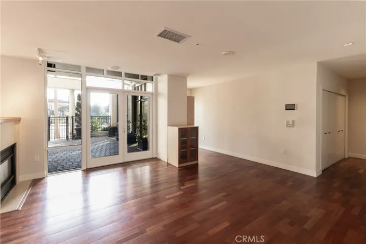 Seller wants it sold! This beautiful condo is appointed with wood floors, lots of storage, a two-sided fireplace, in-room laundry with stackable washer/dryer (conveys). Kitchen boasts 4 burner gas cooktop, oven, microwave, granite countertops, sit at bar and abundant cabinets. Primary en-suite Bedroom/Bath is large and looks out onto the patio. 2 closets with mirrored wardrobe closet doors, large soaking bathtub & separate shower. Secondary bedroom is also large with one closet. Both Bedrooms have access into the patio which has a private gate to access the sidewalk and avoid the elevators, especially convenient for pet lovers!