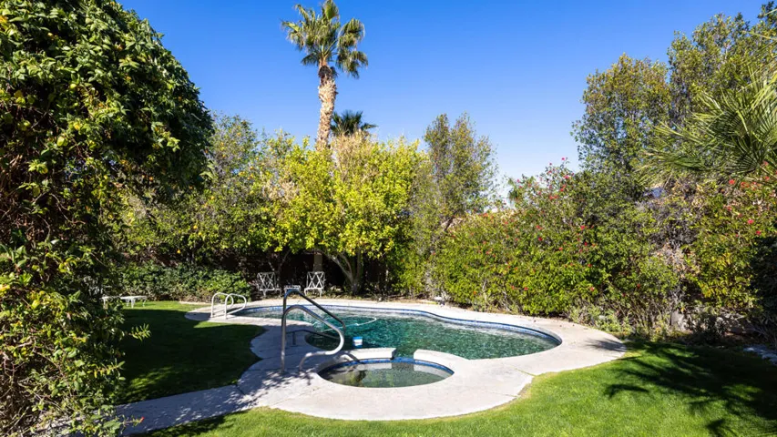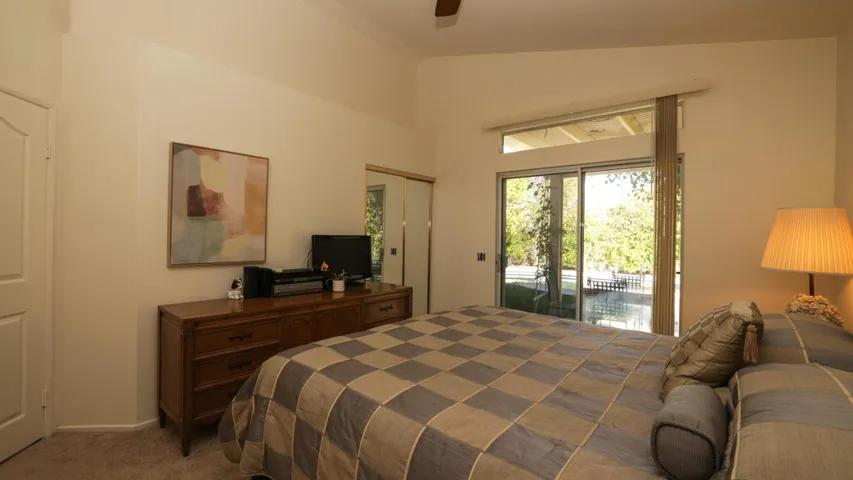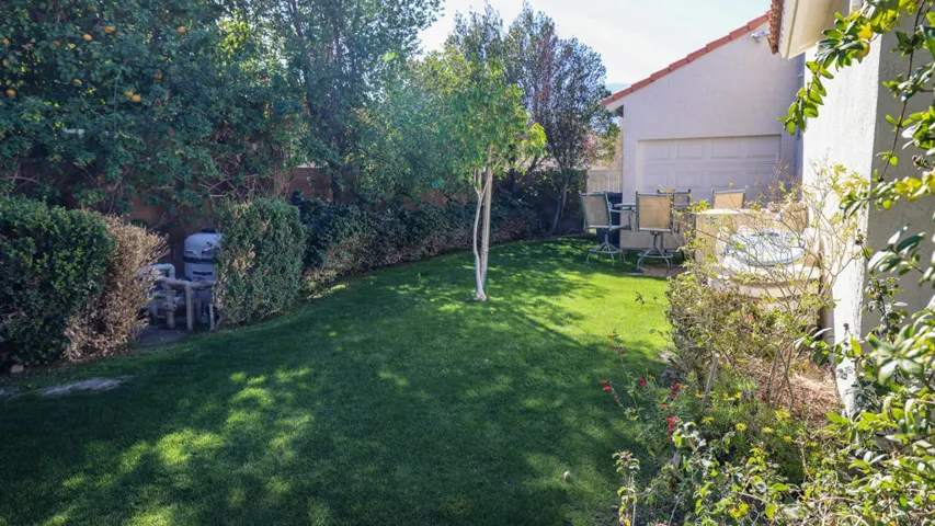 PRICE REDUCED Newly refreshed home in desirable La Pasada neighborhood of Cathedral City. Recently painted both inside and out and newer carpets throughout. 4 Bed 2 full baths, a lush back yard with a pebble tech pool and spa, fruit trees and a coy/goldfish pond (two tiered). Vaulted ceilings throughout the house. 2 car attached garage with a rear garage door for vehicle/boat? access to the back yard. Leased Solar and just minutes from the 10 Freeway and downtown Palm Springs shopping and entertainment