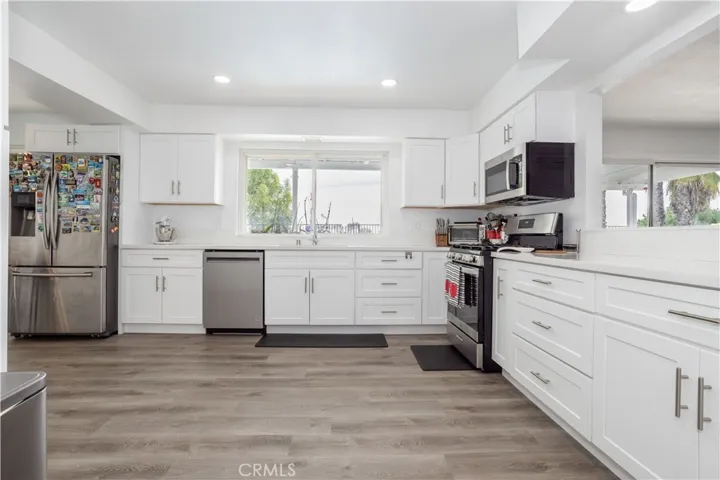 “NOW WITH COMPLETELY REMODELED KITCHEN” This beautiful home is nestled amidst gently rolling hills in one of Granada Hills most prestigious North of Rinaldi Street neighborhoods, and has unobstructed panoramic views of the Valley below. Here are just a few of its many other outstanding features: Its long driveway flanked by lushly landscaped brick capped planters and extensive masonry enhance its eye-catching curb appeal Double doors swing open to a flowing 2,338 square foot open concept floor plan that is in “Move-In-Condition” with plantation shutters, and an aesthetic blend of laminate and tile flooring The spacious living room is bathed in natural light from its sliding glass patio door, and has a cozy fireplace with raised hearty, plus a entertainer’s wet-bar The family’s cook is going to truly appreciate the kitchen’s abundant cabinets, ample quartz counters, durable dual basin stainless steel sink, gas cook-top with ventilation hood, built-in appliances, and the convenience of the very large adjacent dining room 4 bedrooms; The grand suite has a large walk-in closet and a beautifully appointed bathroom with large mirrored vanity, and custom tiled glass enclosed shower with seat plus handheld and rain shower heads A total of 2½ bathrooms; The ½ is located on the first level for your guests Central heat & air for year-round comfort The energy efficient double pane windows and huge solar panel array will help keep your utility bills low You’re going to spend countless hours enjoying the backyard’s spectacular views, covered entertainer’s patio, sundecks, fire-pit, sparkling pool and soothing spa Plenty of secure off street parking on the oversized concrete driveway and in the 2 car direct access garage All of this sits on a huge 10,988 square foot private lot that is within walking distance of Knollwood Country Club and Golf Course, and close to shopping, grocery stores, restaurants, and the 118 freeway .
