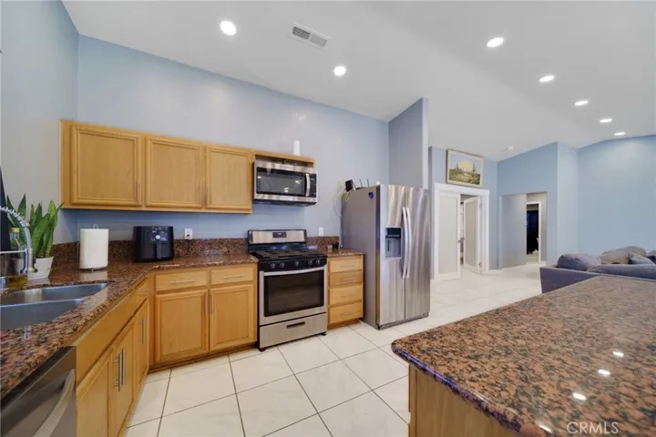 The kitchen is a chef’s dream with large center island, granite countertops, upgraded appliances, large tile floors, recessed lighting with dimmers. The state-of-the-art security system includes HD cameras with surround view of the home day and night with remote gate control from the comfort of your couch should a guest arrive.