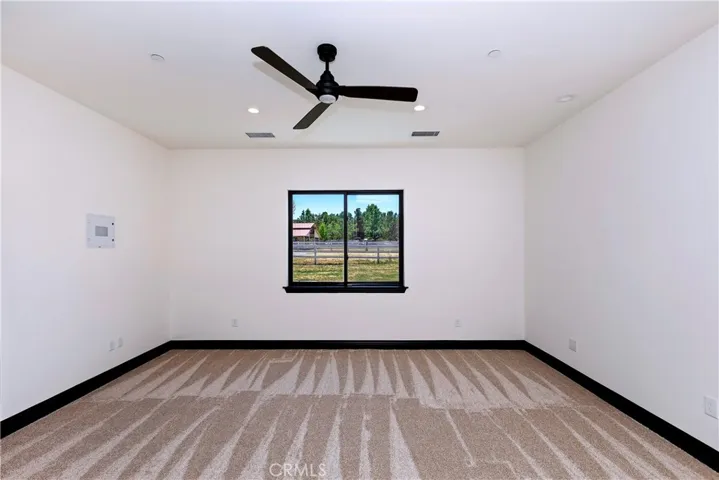 Welcome to 17370 Rodeo Road, a stunning ranch estate home nestled in the exclusive gated equestrian community of Rancho Capistrano near Rancho Mission Viejo. This brand-new luxury residence spans approximately 4750 sqft, plus a 650 sqft attached garage, and is set on a sprawling 2.3-acre lot. The open floor plan includes a separate dining room, family room, and great room with a modern fireplace and a vast wet bar, perfect for entertaining. The gourmet kitchen is a chef’s dream, featuring granite countertops, open shelves, a commercial-grade Bertazzoni dual fuel stove, a large double farm sink, a custom island with a built-in microwave oven/convection oven and warming drawer, ample storage, and a walk-in pantry. The luxurious master suite boasts a gas fireplace, French doors with vineyard views, two large walk-in closets, and an elegant bathroom with double sinks, a jacuzzi tub, and a spacious walk-in shower. Three additional oversized bedrooms and three bathrooms provide ample space for family and guests.