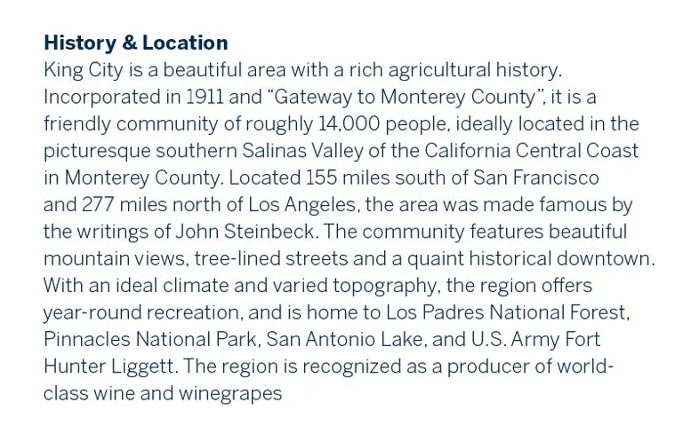 One of the last large development sites in King City, this property is designated as an Opportunity Zone for mixed-use retail/commercial, residential, and visitor-serving (hotel) development. King City, known as the gateway to Monterey County, is a business-friendly community with a growing economy.