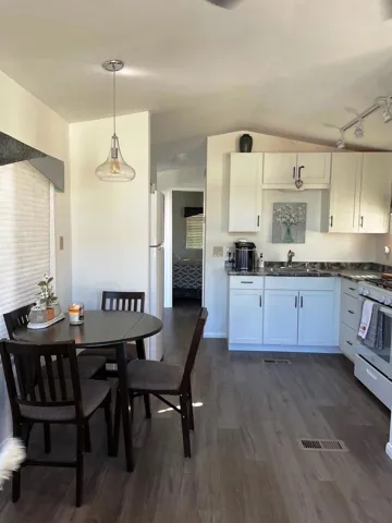 Quiet Location with Green Belt behind. Remodeled a few years ago with covered outside deck. Very Open to Living Area with Laminate Flooring, White Cabinetry and White Appliances including Microwave above stove. Mirrored Closet Doors in Bedroom. Washer/Dryer are in the Shed.