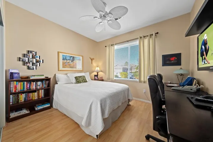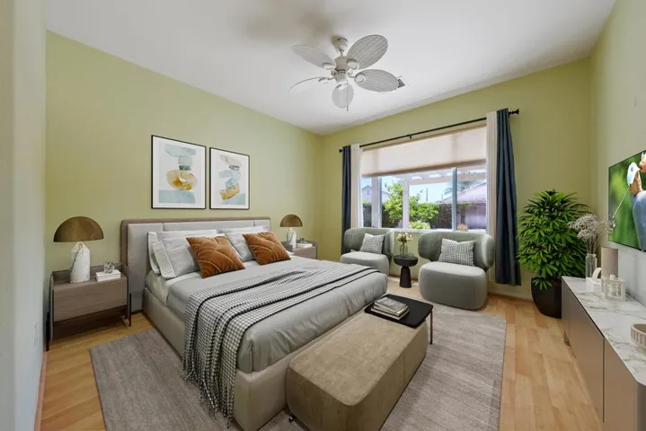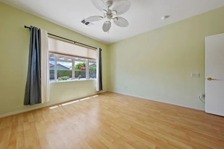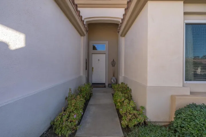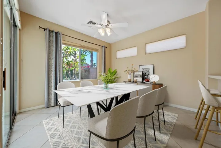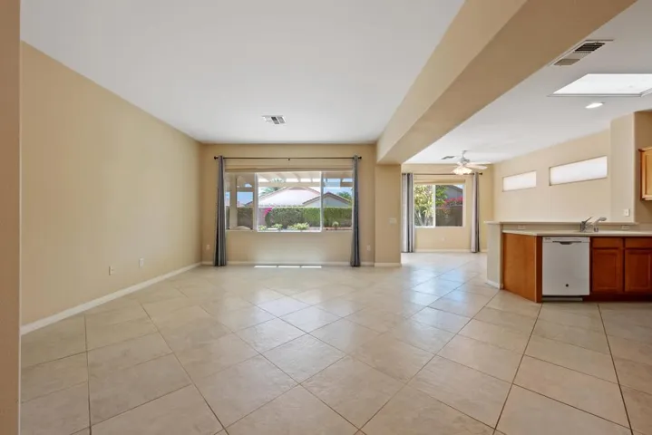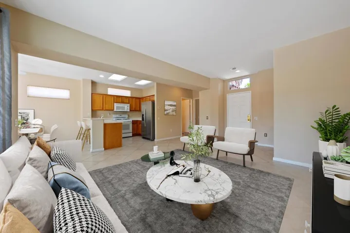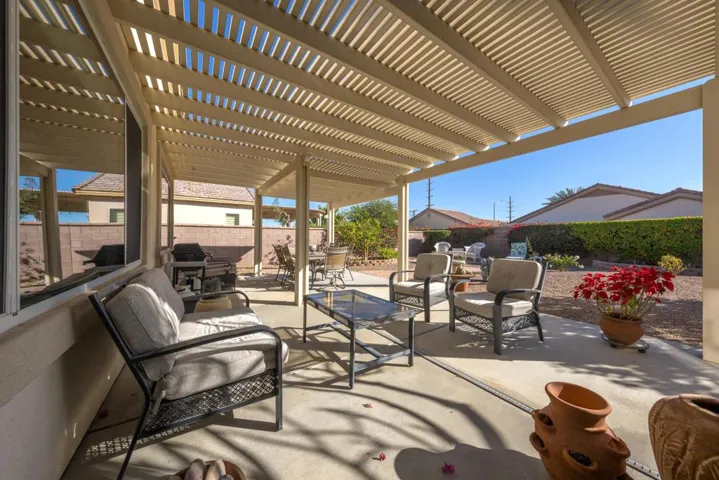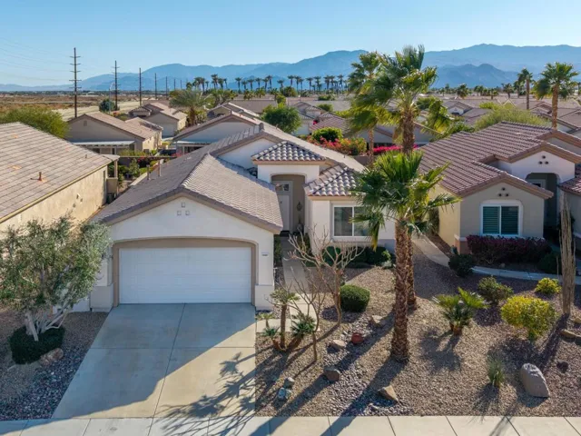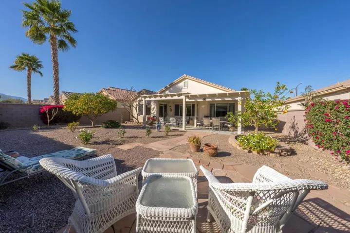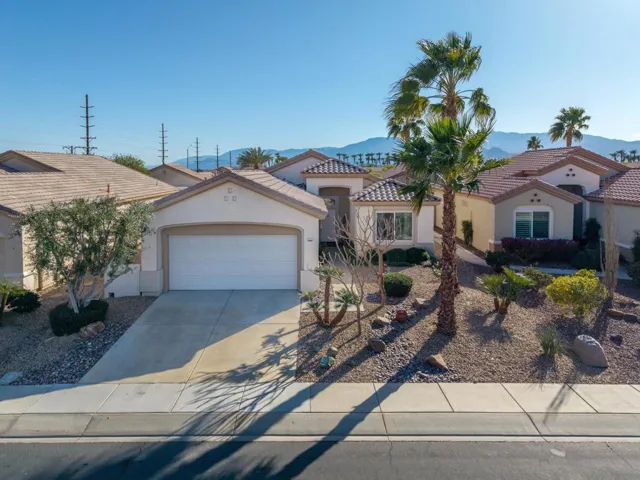 Sun City Palm Desert – Lanai. Located on a secluded cul-de-sac in the quiet northern section of Sun City, this most popular version of the Lanai floorplan has no wall between the kitchen and living room creating an open/greatroom layout. The ultra spacious south facing rear yard provides privacy, an open feel and peekaboo mountain views. Desert landscaping including robust citrus, multiple sitting areas and an alumawood patio cover make the yard perfect for relaxing or entertaining. Inside, 19′ diagonally laid tile is in all but the bedrooms which have wood laminate flooring. The kitchen has corian counters and a breakfast bar. Maple cabinets are in the kitchen and bathrooms. The spacious primary suite has a large walk-in closet. The primary suite bathroom has a sitting vanity and a stall shower with glass enclosure and cultured marble surround. A tub/shower is in the guest bathroom. The guest bedroom has a closet with mirrored wardrobe doors. The laundry room has built-in storage. The extended 2-car garage has an epoxy floor and built-in storage.