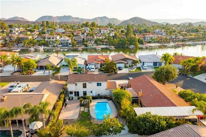 Adorable Pool Home with a huge flat backyard with 3 bedrooms, 2 1/2 baths, loft, living room with fireplace, & almost 1700 square feet across the street from the lake. Cozy living room featuring a wood-burning fireplace with mantel, open kitchen with newly painted white cabinets, stainless steel fridge & dishwasher, & bay window overlooking front yard, kitchen opens up to the dining area with a brand new slider that leads out to the patio and the big backyard & pool. Downstairs also features 1/2 bath that offers a door leading out to the backyard. Newer wood flooring covers the entire main level. Upstairs you’ll find a loft with a fireplace that is the perfect family room, TV Room, or office with built-ins. Good-sized primary bedroom with an attached bath with dual sinks & separate room with shower/commode. 2 additional bedrooms; 1 bedroom with built-in desk, and the other with view of the pool. Additional bath upstairs. 2 car attached garage with laundry & storage (Separate room in the garage that can be removed if desired). Driveway offers boat/trailer parking. Private backyard features a fully fenced sparkling pool with BRAND NEW pump. Beautifully landscaped backyard and front yard with fruit trees. BRAND NEW HVAC system. Located on a great quiet street that is across from the lake. Canyon Lake is an exclusive gated and 24-hour guarded community & includes a private lake for boating, skiing, swimming, wake boarding, fishing, paddle boarding, canoeing, + 6-lighted tennis courts, Olympic size pool, beaches, parks, pickleball and basketball courts, club house, senior center, and clubs plus the community offers an 18-hole golf course golf & riding stables. Tax rate is 1% with no Mello Roos.