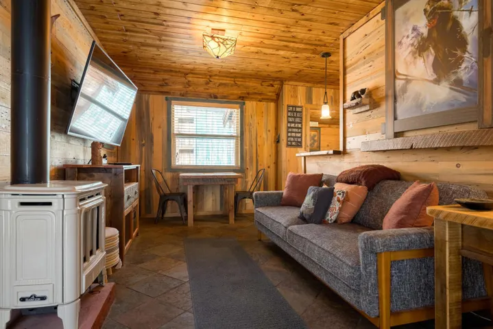 Motivated seller! Your search is over. This charming vintage cabin is ”Simply Irresistible”. Originally built in 1932, tastefully updated with modern amenities, delightful rustic touches and artistic details throughout. Beautiful slate floors, T&G walls, ceilings, and reclaimed wood features. Thoughtful use of the interior space makes for a cozy and comfy living room with an efficient gas-log stove and dining area, and has an adjacent office/study nook. Adorable kitchen has pendant lighting, breakfast bar, and is open to the living room. Remodeled bathroom with impressive slate shower and custom sliding barn door and vanity. Spacious bedroom opens to private patio. Enjoy outdoor mountain living out on multi-tiered deck and patio space surrounding the cabin. Gaze at the stars while soaking in the spa. Smart home features include: wi-fi thermostat w/battery backup, electronic front door lock, automatic lights/camera, plus EV charger. Even has laundry! Situated on a well-treed corner lot in a prime central Big Bear Lake location with easy all-season access and so close to the Village, lake, and forest trails. **NEW BLACKTOP DRIVEWAY** Has been a highly successful vacation rental. Go take a look ~ you’ll fall in love.