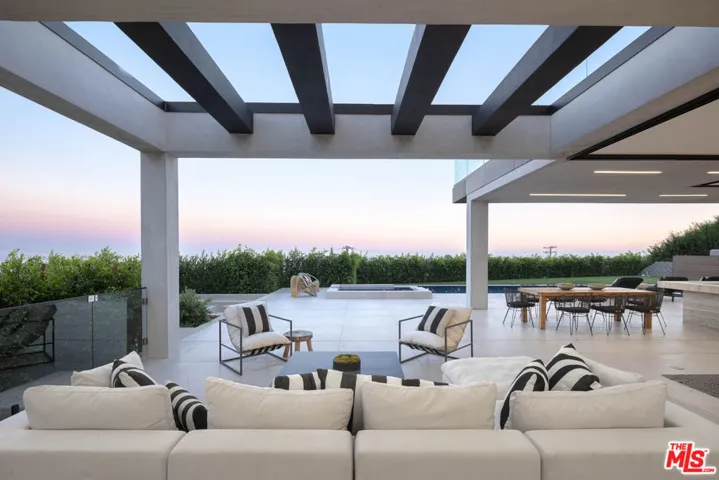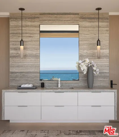 Extraordinary New Construction in Malibu. Located in the private, gated enclave of Malibu Colony Estates at the beginning of Malibu Rd, this stunning home offers breathtaking ocean views and contemporary design by renowned architect Douglas W. Burdge, AIA. One of just four homes in this prestigious community, this crowning jewel sits on approximately 1.3 acres with five bedrooms and ten bathrooms. A dramatic pivot entry door, framed by sculptural water features, sets the stage for the seamless indoor-outdoor flow of the home. Expansive glass walls, high ceilings, and premium materials like vein-cut travertine and rare Calcutta Gold stone enhance the elegant design. The grand living room features a striking floor-to-ceiling Blue Bibas marble fireplace, while the gourmet kitchen is equipped with top-of-the-line appliances and custom backlit cabinetry. Designed for effortless entertaining, the outdoor spaces include multiple lounge areas, a covered bar that seats six and an outdoor dining space. The private backyard also features an infinity pool and spa, a firepit with banquet-style seating, and a fenced lawn ideal for pets or play. The main level of the home includes a media area, a full bar with bifold doors to the patio, a spacious dining area, and an impressive office with stunning views. A guest suite with an en-suite bath completes this floor. Upstairs, the primary suite is a private retreat with two en-suite bathrooms, dual walk-in closets, and a wraparound patio with ocean and mountain views. Three additional en-suite bedrooms provide ample space for family and guests. The lower level is designed for entertainment and relaxation, featuring a home theater, game room, gym/bonus room with large bathroom for a possible sixth sleeping area, powder room, and laundry room. A three-car garage, ample guest onsite and street parking, and an elevator add to the home’s conveniences. Just minutes from Malibu’s top beaches and shopping, this estate offers a rare combination of luxury, privacy, and breathtaking surroundings.