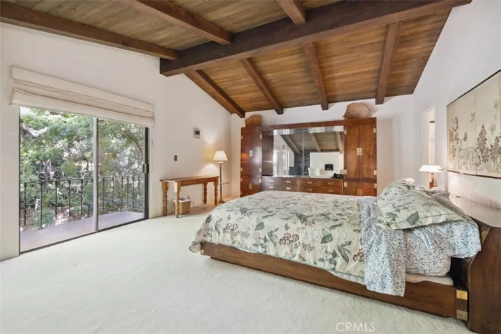The residence includes five bedrooms and four and a half baths, thoughtfully designed for privacy and easy flow. The primary suite enjoys vaulted ceilings, a generous en-suite bath, and views of the surrounding landscape. Several guest bedrooms open directly to the outdoors, creating flexibility for multi-generational living, guest quarters, or work-from-home setups. Throughout the interior, original details and quality construction offer a strong foundation for personalization and updates.
