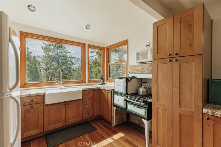 Perched above Big Bear Lake with stunning lake and mountain views, this fully furnished, ready-to-enjoy retreat in the National Forest offers a spacious private parking area and year-round access. If you’re looking for your own private getaway for your family and/or have friends or family that you would like to partner with, and you don’t want the responsibility/hassle of vacation renting out your treasure, keep reading! This Forestry Cabin does not allow short-term rentals, offering a serene escape surrounded by trees and the lake (at a fraction of the price of comparable homes this close to the lake). The lake is directly across the street, offering instant access for kayaking, fishing, and soaking in the beauty of the water and surrounding mountains. Offering peace of mind, the new roof was installed November 2024! Current owners pay an affordable $2,720 annually for CA Fair Plan insurance. This 4-bedroom, 3-bath home comfortably sleeps 9, making it perfect for families and groups. Originally built in 1920 and completely renovated down to the studs in 2013, it seamlessly blends modern conveniences with classic mountain charm. The spacious living area boasts vaulted ceilings, a striking stone fireplace, and expansive windows framing breathtaking lake and forest views. The open kitchen features granite countertops, modern cabinetry, and a fully functional vintage Wedgewood stove, adding a unique touch to your cooking experience. Private guest quarters offer added flexibility for hosting, while a second family gathering space provides extra room to relax, entertain, or take in the scenery. Originally enjoyed by renowned artist Victor Clyde Forsythe, a close friend of Walt Disney, this space still holds preserved sketches and notes from his time here, adding a unique historical touch. Expansive decks and balconies provide the perfect vantage point to take in the ever-changing beauty of the lake, with direct access to some of Big Bear’s best outdoor activities just steps away. Enjoy a one-of-a-kind cabin experience with artistic history, spacious living, and the natural beauty of Big Bear at your door!