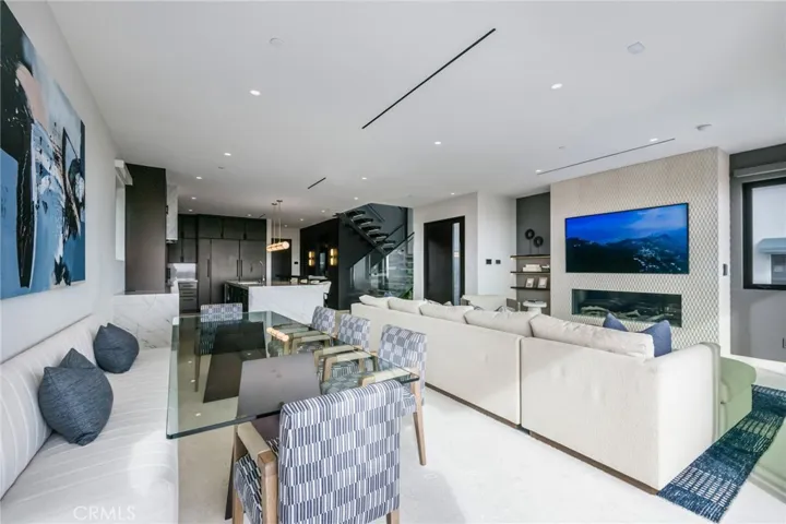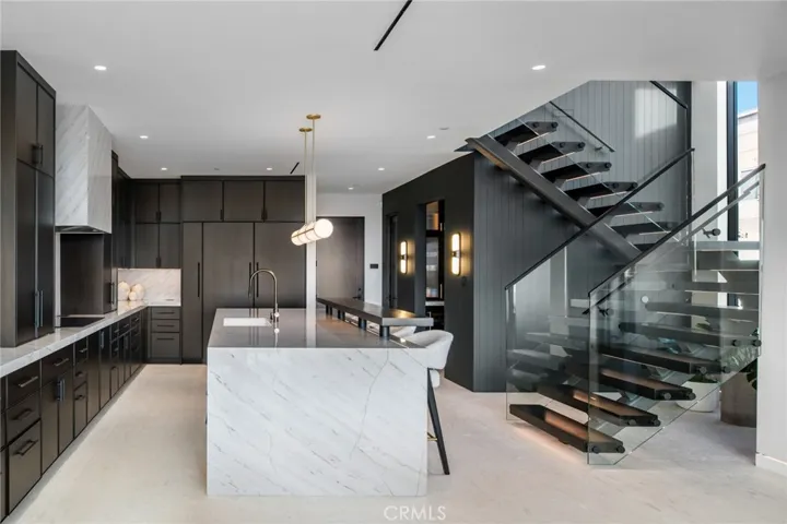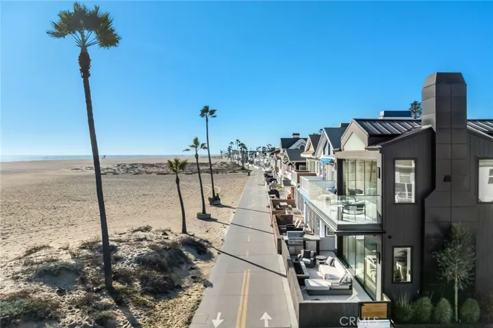 218 Oceanfront: an exceptional and singularly rare residence. Sited on a scarce corner lot, this beachfront home offers the ultimate refined on-the-sand lifestyle. A rigorous to-the-studs reimagining was recently completed, resulting in coveted contemporary lines and breathtaking ocean vistas from both levels. Expert layering of rich, contrasting elements including wood, stone, and glass throughout creates an ambiance of timeless luxury. The main floor invites the exteriors in through a wall of automated glass doors spanning the length of the front, seamlessly connecting an oceanfront patio with the great room. This ample space with a fireplace encompasses a living area, a dining section, and the home’s remarkable kitchen. Anchored by a grand waterfront edge quartzite-topped island, this culinary haven features a combination of Wolf, Cove, and SubZero appliances, bespoke cabinetry, and a large butler’s pantry, adding further functionality to this elegant space. A sleek, floating wood-and-glass staircase connects the two levels, creating a visual statement. The primary suite is all about coastal opulence, with dramatic vaulted ceilings, an ocean-view deck, and a fireplace. With floating double vanities, a freestanding tub, a large shower, and an impressive closet, the exquisite bathroom creates an atmosphere of indulgence. Three secondary bedrooms and a functional loft complete the upper floor. While offering refinement, this residence lacks no conveniences: from an oversized garage with a lift for a third vehicle to a whole-house Savant smart system that controls the home’s automation. Featuring ease of access to the area’s highlights, 218 E Oceanfront offers a premium location on the Balboa Peninsula.