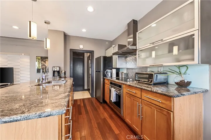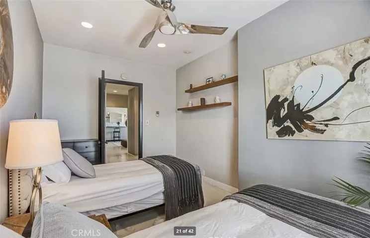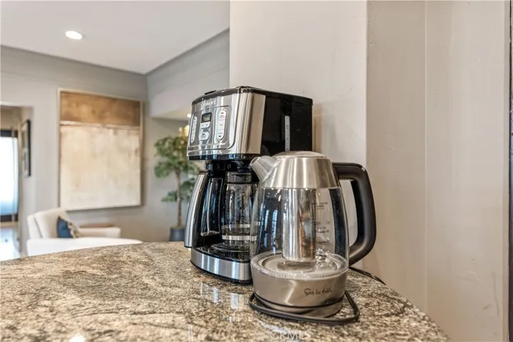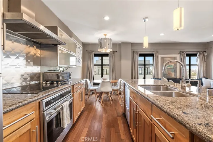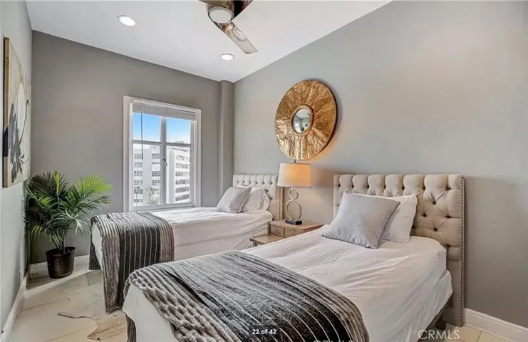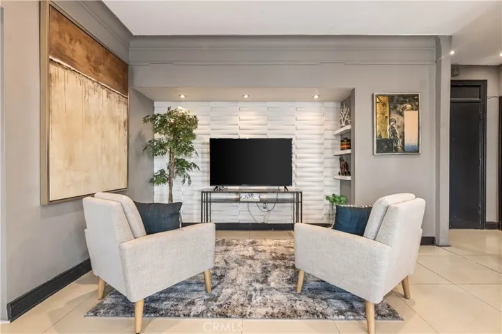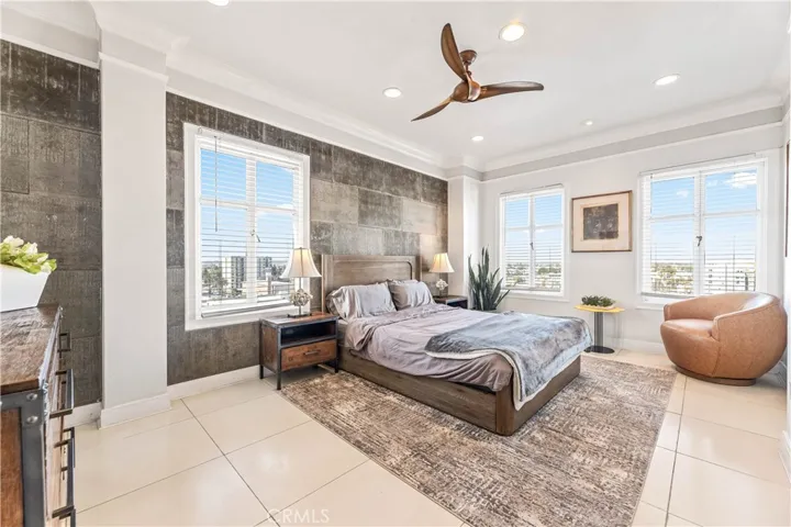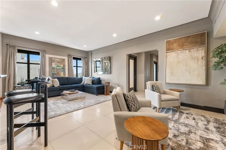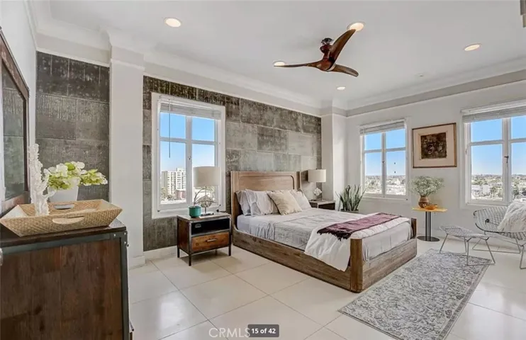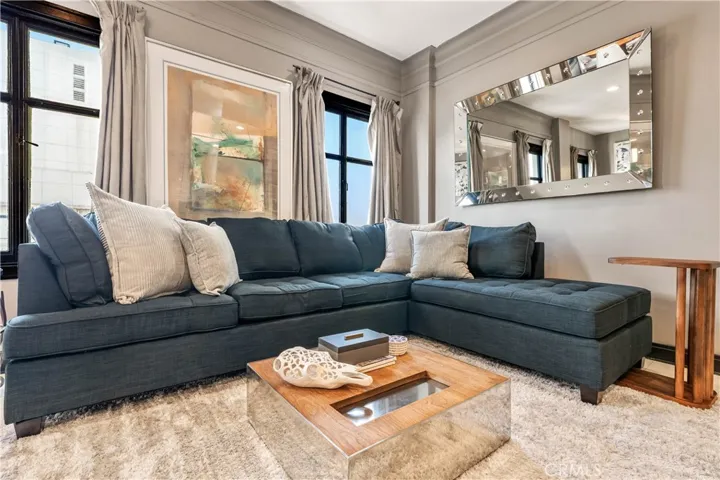Perched on the 9th floor of The Lafayette Building, this beautifully furnished 2-bedroom, 2-bathroom corner residence offers a sophisticated urban lifestyle in Long Beach’s vibrant East Village Arts District. The home features striking Australian Sandstone flooring and a fully renovated kitchen adorned with Brazilian Mahogany wood floors, granite countertops, a sleek glass backsplash, and an elevated breakfast bar perfect for casual dining or entertaining.