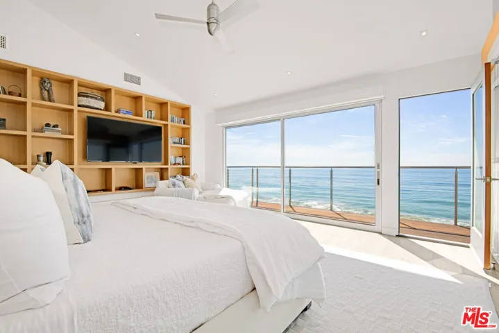 Extraordinary ocean front 5 bedroom estate, situated in the prestigious enclave of the guard-gated Malibu Colony. Walls of glass enhance magical sweeping views of the Santa Monica Bay coast to serene sunsets. Enjoyment can be found in the expansive front entertainment room with charming window seating, a flat screen tv and built-ins. The grand chef-style kitchen offers high-end appliances and double islands in Caesar stone, joining the dramatic living area with soaring ceiling and opens to the seaside patio, lounging deck & stairs to the beach. Ocean front primary suite, with lounging balcony, encompasses the upper level with sumptuous bath & outdoor hot tub on a private rear deck offering mountain views. There are 2 additional bedrooms in the main house. A separate guest unit includes an upper level entertainment room, large bedroom with mountain views & bathroom. Main floor bedroom with bath opens to the private central patio area with a BBQ. Beautiful recent interior designer enhancements make for ultimate comfort while living by the ocean. Smart home integration system throughout the main home. Call listing agent regarding Summer rental months. Nearby to great restaurants, well-known shops, Whole Foods, Malibu Pier & more!