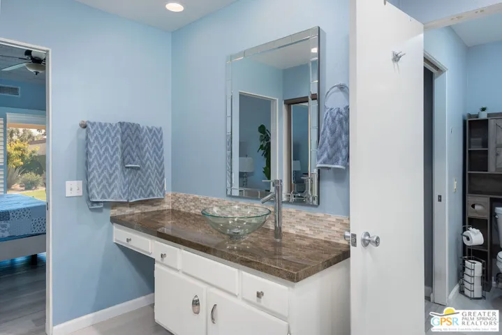 Experience the ultimate country club lifestyle in this beautifully upgraded 1,049 SqFt single-level end-unit with only one shared wall for added privacy within the prestigious Mission Hills Country Club. Situated in a quiet location, just steps from 3 community pools, this residence offers exceptional privacy and two inviting covered patios, complete with pergolas, perfect for entertaining and relaxation. Inside, discover a light and airy open floor plan featuring vaulted beamed ceilings, creating a warm and spacious ambiance. Recent renovations include new flooring, stainless steel appliances, double-pane sliding doors and windows, custom plantation shutters throughout, upgraded lighting, a stylish fireplace tile surround, and a luxurious walk-in shower. A high-capacity washer/dryer adds to the convenience. The well-appointed kitchen seamlessly flows into the great room, ideal for open concept living. A large, detached two-car garage, located just steps away, provides ample storage. Mission Hills Country Club, a guard-gated community in desirable Rancho Mirage, is renowned for its rich history and world-class amenities. Members enjoy access to three championship golf courses, 30 tennis courts (grass, clay, and hard), pickleball courts, croquet, a state-of-the-art fitness center, spa services, and multiple dining and social venues. Located minutes from Palm Springs International Airport, El Paseo Shopping, and major entertainment, this is your opportunity to embrace the coveted Mission Hills lifestyle.