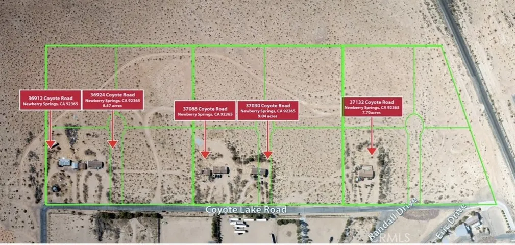 These parcels of land totaling 25 plus acres are on prestigious Coyote Lake Rd in Newberry Springs, California. As the original developer of Crystal Lake holds these cash flowing assets with great potential to 24 total homes – this opportunity is unparalleled. Situated on paved Coyote Lake Rd and connected to the Coyote Lake Water System, these parcels are ready for immediate utility access, making development a seamless process. Splitting these parcels into 4 lots and each having two homes is what’s already commonly done here and you wont have to deal with the added subdivision red tape.