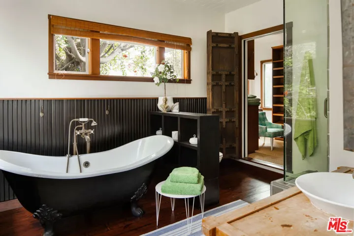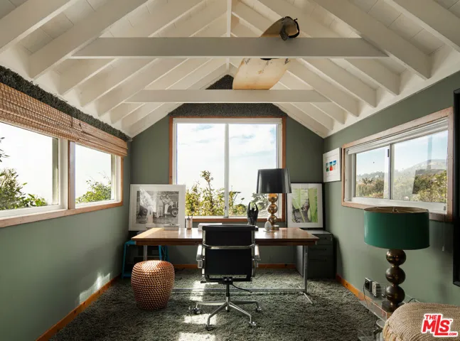 Nestled on a double lot in Western Malibu, this exceptional estate boasts a spacious, light-filled home with soaring ceilings, breathtaking ocean views, and lush landscaping, offering unparalleled privacy. The dual lots create a serene setting around the gated Cape Cod-style main residence and guest house, offering seamless indoor-outdoor entertaining spaces with the sounds of the waves as a backdrop. Inside, steeply pitched plank ceilings, skylights, generous built-ins, large windows, and wood floors define the open-concept design. The welcoming entryway leads to a dramatic two-story living room with ocean views, a cozy fireplace, a charming bay window, and a staircase leading to the upper level. A loft-style hallway lined with windows bathes the central living space in natural light. The adjacent kitchen is an entertainer’s dream, featuring greenhouse skylights, stunning garden and ocean views, a glass-topped island with bar seating, premium appliances, an impressive butler’s pantry, and a dining area wrapped in windows showcasing breathtaking ocean vistas. Just off the kitchen and living room, a wraparound wood deck offers a seamless extension of the living space, complete with a pergola-shaded lounge, dining area, outdoor sound system, and steps leading to a private courtyard with a hot tub. Upstairs, the home offers three beautiful bedrooms, including a luxurious primary suite with a serene ocean-view sitting area, a walk-in closet/safe room, and a spa-like bath with a free-standing tub. The additional bedrooms each feature bay windows with built-in seating, and one includes a charming ladder-access loft. Across the main-level deck, a separate two-story guest house/studio/office offers soaring wood-plank ceilings, a powder room, breathtaking views, and soundproofed wall is ideal for creative pursuits or work-from-home convenience. Additional highlights include a two-car garage, direct keyed beach access, air conditioning, central vacuum, a security system, and spectacular gardens with a waterfall, koi pond, detached writing studio/office, and meandering pathways. A rare offering, this estate epitomizes gracious living, breathtaking views, and the ultimate in private Malibu luxury.