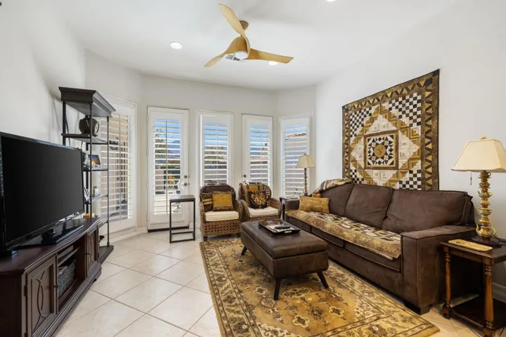 La Quinta Fairways is one of four key associations affiliated with PGA West. This sought after floorplan has a spacious courtyard entry offering stunning south-facing mountain views, creating a warm and inviting first impression. A glass front door welcomes natural light into the foyer and expansive great room beyond.The home features light wood-look porcelain tile flooring, seamlessly blended with diagonal tiles throughout. Painted wood shutters adorn most windows and doors, adding charm and character. Each generously sized bedroom includes an en-suite bath, ensuring comfort and privacy for all. The third bedroom has french doors to the courtyard and can serve as an attached casita. The luxurious primary suite boasts direct access to the backyard, where a pool and spa provide a private retreat. Drift off to sleep with the soothing sound of the spa waterfall just outside your window. The garage is temperature controlled with a mini-split and the flooring is custom installed rubber tiles in shades of gray. Lucky cars! Meticulously maintained, this home is a true gem in La Quinta Fairways, a guard gated community located conveniently in the middle of La Quinta, close to restaurants, groceries and shops.