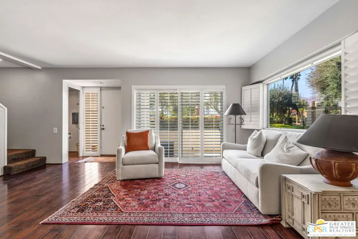 Welcome to Palm Springs Country Club Phase One, a hidden gem designed by William Cody AIA, one of Palm Springs’ best-kept secrets. This architectural townhouse-style condo features 2 bedrooms, 1.5 baths, an updated kitchen, and an updated powder room downstairs. It offers laminate flooring throughout, except for the staircase, and stunning views of the San Jacinto mountains from both the living room and bedrooms. The HOA fees include basic cable and internet. The property is conveniently located near unassigned, uncovered parking. Fee simple land.