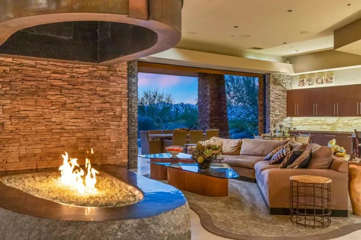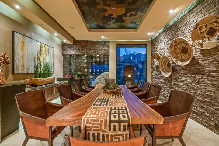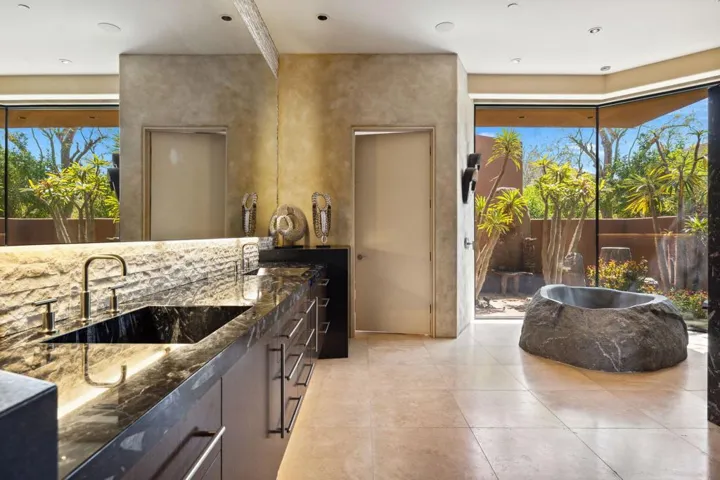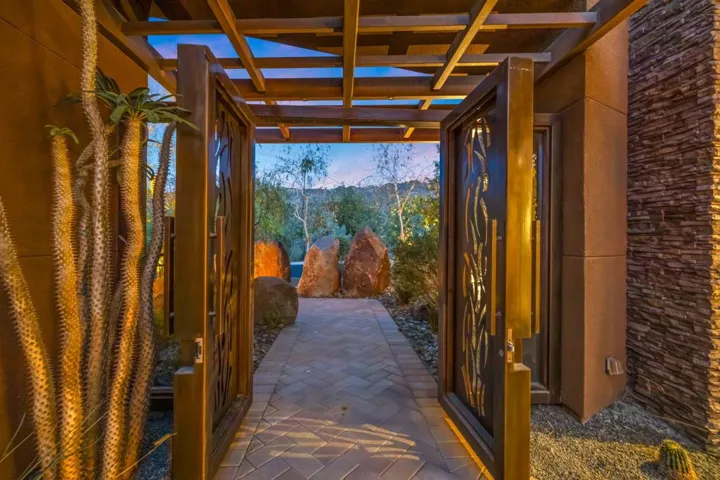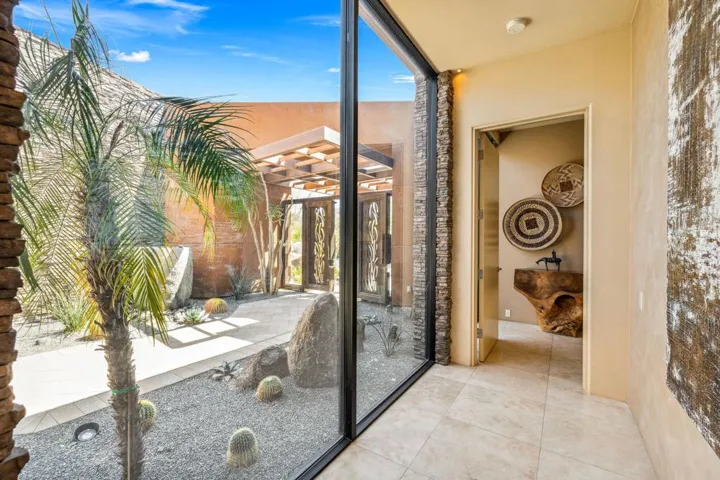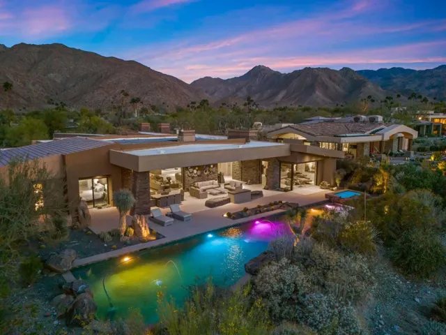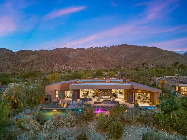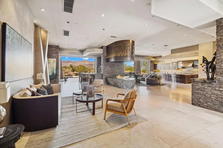 Welcome to 50741 Desert Arroyo Trail, a luxurious custom estate on a premium lot overlooking the 13th fairway of The Reserve Club in Indian Wells. Built by acclaimed Foxx Construction with design by Angela Wells, this 6,135 sq ft single-level home offers the ultimate in desert elegance, privacy, and seamless indoor-outdoor living.Featuring five spacious en-suite bedrooms and five and a half bathrooms, the open floor plan is ideal for both relaxed living and grand entertaining. A dramatic boulder-carved fireplace anchors the great room, where floor-to-ceiling glass doors reveal breathtaking mountain and golf course views. The chef’s kitchen boasts a large granite island, high-end wolf appliances, sub-zero refrigerator and a walk-in pantry.Luxury amenities include a soundproof home theater, temperature-controlled wine room, and wet bar, perfect for hosting. The primary suite is a private retreat with natural stone soaking tub, dual vanities, and a private outdoor shower.Step outside to a spectacular backyard with lap pool, spa, waterfalls, pop-up TV, fire pits, misting system, built-in BBQ, and patio heaters, every detail curated for resort-style living.Additional features include airconditioned 4 -car garage plus +1 golf cart space, owned platinum package solar, and smart home technology. Offered furnished per seller’s inventory.Living in The Reserve offers unmatched privacy and security with 24-hour guard-gated protection, roving patrols, full time concierge, an on-site private post office, and dedicated HOA staff. With fewer than 250 homes, residents enjoy an exclusive, close-knit community enriched by a vibrant social calendar including wine dinners, themed parties, fitness classes, and kids’ activities creating a lifestyle where neighbors truly become friends.