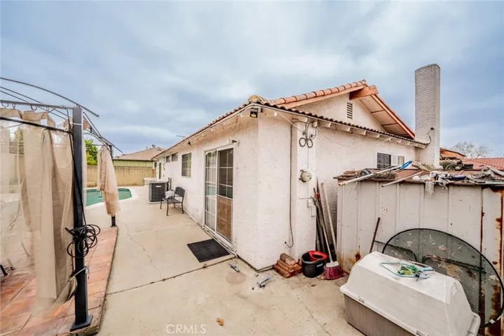 The backyard is primed for hosting unforgettable family gatherings, complete with a sparkling pool and space for barbecues.