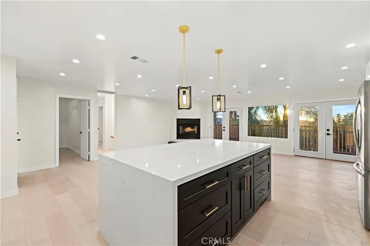 Step inside to discover an open floor plan accentuated by elegant hardwood floors and recessed lighting throughout. The living area features a cozy fireplace, perfect for relaxing evenings. The heart of this home is the gourmet kitchen, equipped with stainless steel appliances, including a range, range hood, refrigerator, and dishwasher. The island kitchen, adorned with premium counters, provides ample space for culinary creations and gatherings.