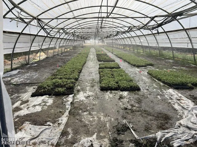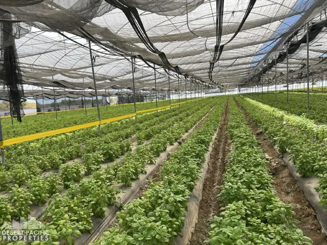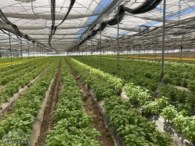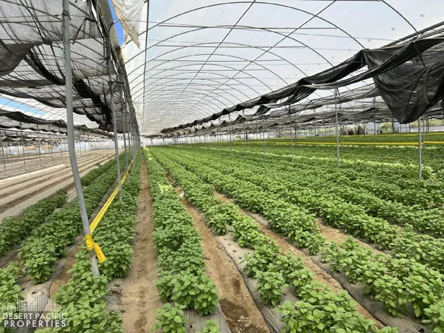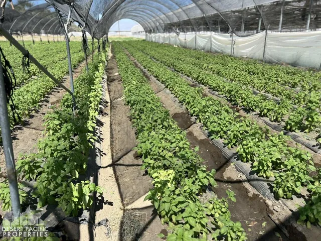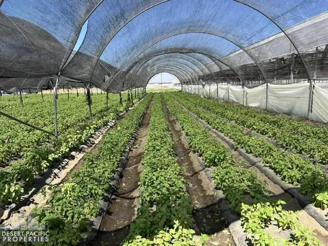 Prime organic agricultural operation in the Coachella Valley consists of: 8,000 sf packing building with 2 evaporative coolers with 1,800 sf walk-in cooler (50×36)/freon cooler (38- 40), three 14′ roll-up doors, and loading dock. 8 greenhouses. 1.25 acre each. 21 mesh houses. 6 tunnels. 4,800 sf shop building with two 14 ft roll-up doors and germination room. Modular office building with 3 offices. Mobile home for caretaker unit (not included in the sale). Two wells, (approx. 100) 4 pumps, filter station, and reservoir. Low cost abundant Coachella Valley Water District (CVWD) irrigation water and two wells. Easy access to Expressway 86. In Federal Opportunity Zone, with potential for tax benefits. In Agricultural Preserve, which maintains low property taxes. NNN charge: TBD. Appointment only. Call Susan Harvey at 760-250-8992.