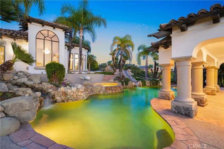 • Two pools: One with a waterfall and pool house, the other with waterslides and a grotto.