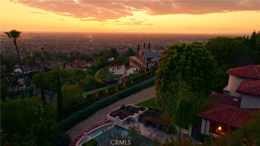 This estate is a compound unto itself, encompassing a guest house, carriage house, multiple garages, a recreation center, and an outdoor veranda exceeding 1,000 square feet, perfectly suited for grand entertaining or quiet sunsets. A circular motor court, central fountain, and garden pathways invite discovery. At the rear, an infinity-edge pool and spa command dramatic views by day and glittering city lights by night.