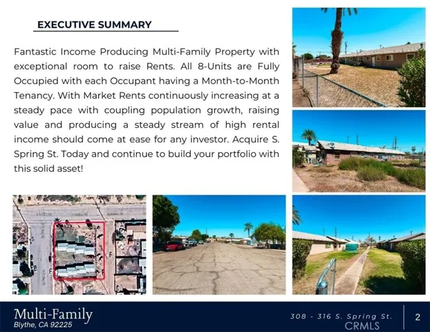 Fantastic Income Producing Multi-Family Property with exceptional room to raise Rents! All 8-Units are Fully Occupied with each Occupant having a Month-to-Month Tenancy. With Market Rents continuously increasing at a steady pace, raising value and producing a steady stream of high rental income should come at ease for any investor. Acquire S. Spring St. Today and continue to build your portfolio with this solid asset!