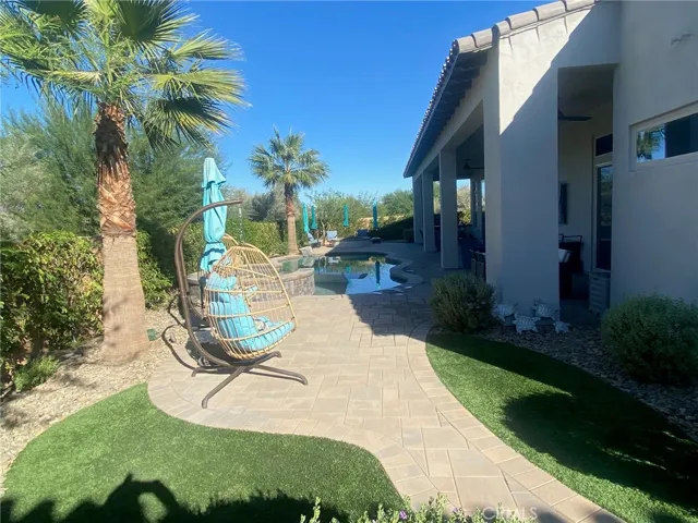 PRICE REDUCTION!! Introducing, this gorgeous, Estate Style, Turn Key Home in prestigious Griffin Ranch gated community. The south facing home sits on a large corner lot with a beautiful huge, park like area on two sides and a very private back yard. There is only one contiguous neighbor to the west. The Sellers purchased the home, preconstruction, in 2019, with many Builder upgrades and amenities added during construction, such as, a saltwater swimming pool and spa with tanning shelf, ambient lighting and tranquil waterfalls, a large covered patio in the pool area, ceiling fans, a built in barbeque with misters, gas firepit, and a putting green. The Sellers just installed all new upgraded Landscaping. A brand new Whole Home water filtration system was also just added, a $7,500 Valve. $8,000 in all new carpeting and padding added 10/9/2025. There’s a two car garage + a golf cart garage (Sellers Golf Cart/charger and some furniture items are negotiable for sale out side of escrow.) Custom Epoxy floors in all garage spaces with built in custom storage cabinets. The unique open floor plan with the Living Room/Great Room having high ceilings, a Grand Fireplace and 10 foot sliding glass doors that open into the pool area, Also, a Formal Dining Room, a spacious separate Office that can be used as a 4th Bed Room and Laundry Room with sink, upper and lower cabinets and clothes folding area. The Master Bedroom has a modern en suite Bathroom with Soaking tub and large Walk in closet. The other bedrooms each have their own private Bath and the home has a 4th guest Bathroom. The Gourmet kitchen includes a large prep Island with Granite Counter Tops and Backsplash, an Eating area, a 6 burner Stovetop with dual Ovens and state of the art Stainless Steel Thermador Appliances and a large walk in Pantry. Included is an additional Refrigerator in the garage and rear patio, along with the Three + Big Screen TV’s that are included in the sale. A Custom sound speaker system in the Living Room/Great room, Master Bedroom, Office, and Back and Front Patios that can be controlled individually. There is a existing ADT Security System on the premise. The new Owners can contact ADT if they wish to reactivate the system. H.O.A amenities include: State of the Art Clubhouse w/Pool, Spa and Fitness Center, Pilates & Yoga Studio, Ping pong & billiards room, Tennis, Bocce and Pickle ball courts, Putting Green, Dog Park, etc. Property is close to PGA West & PGA Greg Norman Communities.