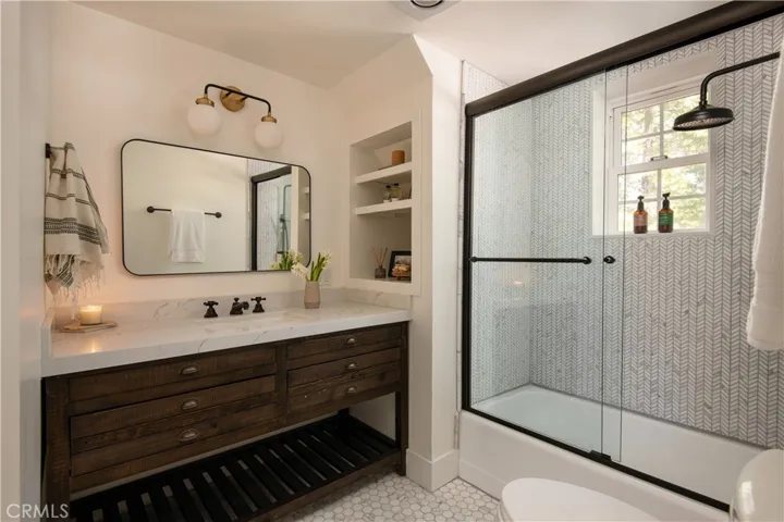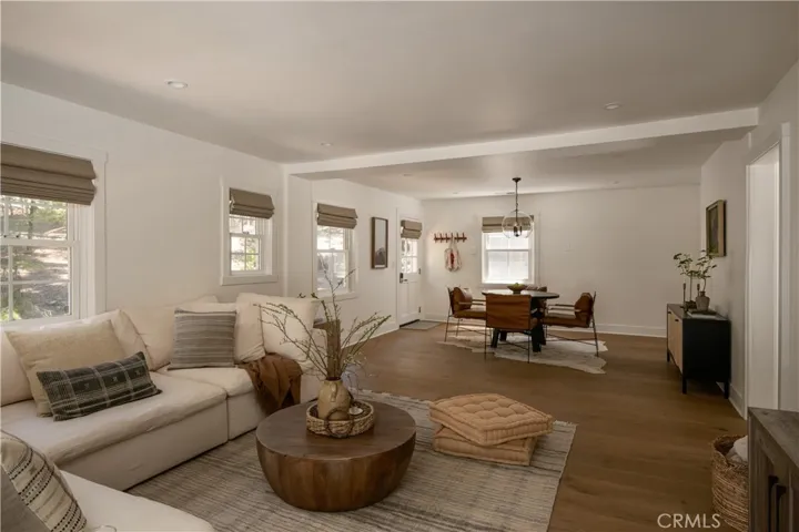 Stunningly Remodeled Mountain Retreat in Sky Forest, Lake Arrowhead with a LAKE RIGHTS parcel as an option to purchase. Nestled in the serene Sky Forest neighborhood of Lake Arrowhead, this beautifully remodeled 3-bedroom, 4-bathroom home offers a perfect blend of modern luxury and natural tranquility. Surrounded by towering pine and cedar trees, including graceful dogwoods, the property provides a peaceful retreat just moments from town and the lake. Step inside to discover a thoughtfully designed interior, featuring two spacious living areas, one with a stone fireplace, that invite both relaxation and entertaining. The heart of the home is the designer kitchen, fully equipped with high-end finishes and surrounded by natural light that pours through large windows, creating a warm, welcoming atmosphere. Enjoy cozy meals in the charming dining nook, set against rustic stone walls, or host in the elegant dining room with panoramic windows that frame breathtaking views of the forested landscape. Directly adjacent is a uniquely expansive deck in a private setting, the ultimate site for outdoor entertaining or simply enjoying the fresh mountain air. Whether you’re sipping your morning coffee or hosting evening get-togethers, this space is designed for making lasting memories. The home’s layout includes spacious yet cozy bedrooms, each with beautiful natural light, designer details and amenity filled bathrooms, and a dedicated bunk room—perfect for guests or family gatherings. With four bathrooms, you’ll never have to worry about space or privacy. With unparalleled proximity to the attractions of Kuffel corner, the home is the perfect serene mountain escape while also providing a small town experience. Additional features include a hot-tub, three-car oversized garage and lake rights, making this the perfect year-round getaway for both relaxation and adventure.