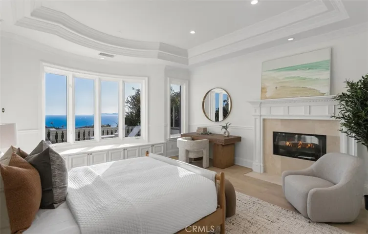 Designed for both grand entertaining and intimate relaxation, the home features five expansive en-suite bedrooms. Notably, two are primary level suites with sweeping ocean views through exceptional picture windows, and each adorned with a fireplace and private terrace—providing serene retreats that capture the essence of seaside living. All bedrooms are generously sized, with four featuring their own fireplaces and terraces, enhancing the indoor-outdoor lifestyle.