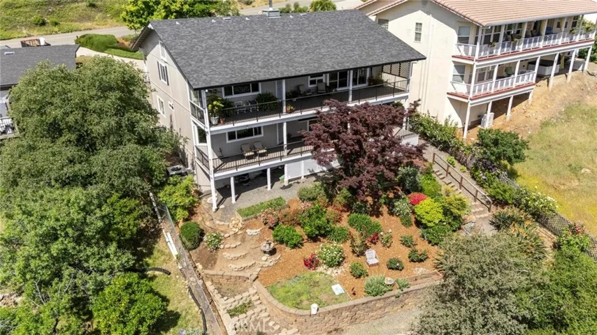 Welcome to LAKEVIEW LUXURY living at its finest! Perched above Lake Oroville with panoramic water views from both levels, this 3,165 sq. ft. residence is a rare blend of elegance, comfort, and thoughtful design. With 4 bedrooms, 2.5 bathrooms, two stories, and two spacious living areas, this home is ideal for those seeking upscale lake living with room to relax and entertain. Step inside the formal entry and immediately notice the luxury finishes throughout — from the travertine floor entry to the heated travertine floors and marble touches in the spa-like primary bathroom, to the warm ambiance created by the wood stove upstairs and pellet stove downstairs. The primary suite is a true retreat with a walk-in closet, soaking tub, and serene views. The gourmet kitchen features a brand-new dishwasher and flows seamlessly into the upper-level living space and covered Trex deck, where ceiling fans and lighting enhance outdoor dining and sunset viewing. A second covered porch on the lower level offers additional space to enjoy the lake views. Practical features abound: central heat and air, owned solar and propane tank, backup generator, and a fire sprinkler system around the home’s exterior offer peace of mind. The landscaped front and terraced backyard are served by a drip irrigation system and include fruit trees and established gardens. Other highlights include a large interior laundry room with abundant storage, an attached 2-car garage, and a second parcel of vacant land at the backside of the property that can be purchased separately for added privacy. Multifamily/shared living potential with split-level setup. Rare opportunity to own an elevated stick-build home in the sought-after Kelly Ridge neighborhood.