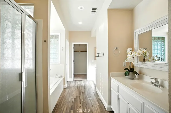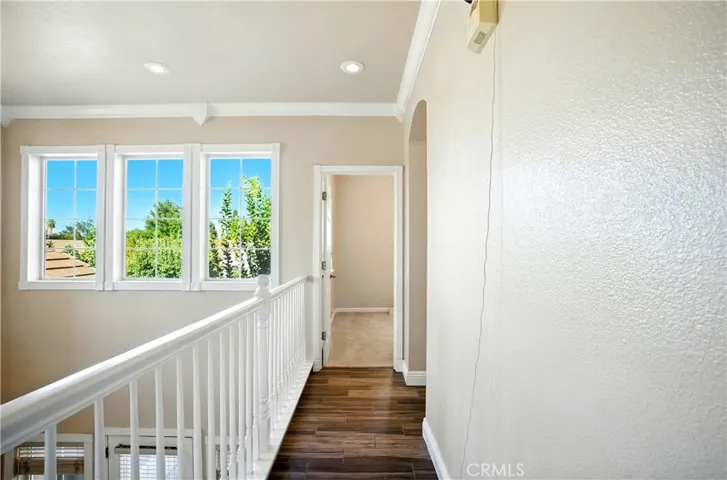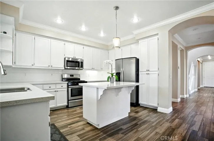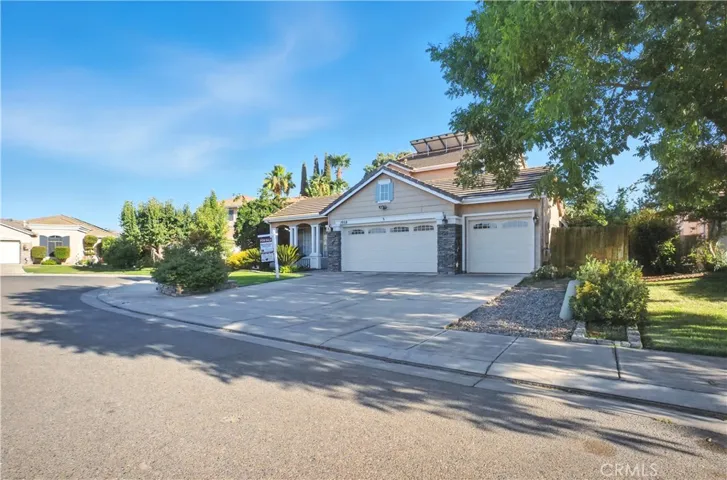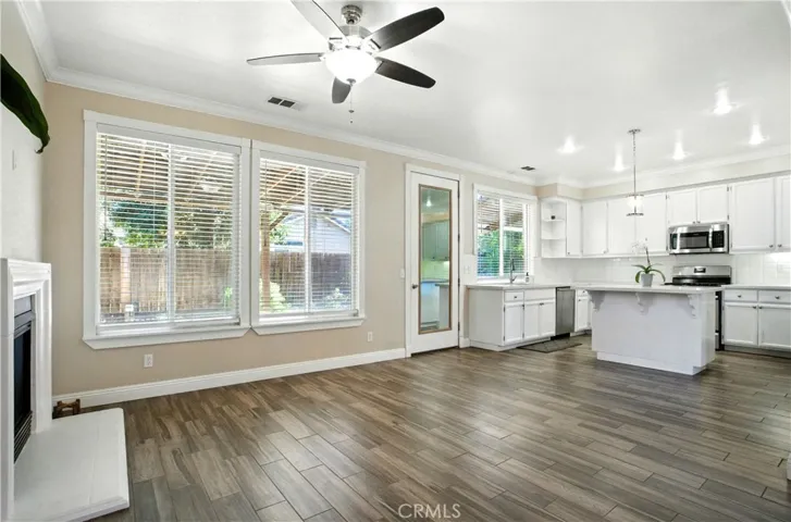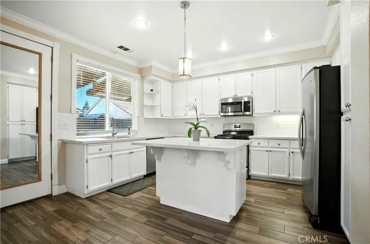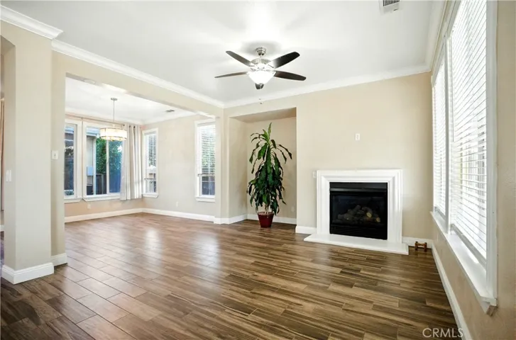 PRICE IMPROVEMENT ON THIS WELL MAINTAINED 4 bd/3 ba in Move in Condition!! This bright and airy home features an open floor plan with wood toned tile flooring throughout the main living areas, Crown Molding and an abundance of windows that fill the space with natural light. Two sitting areas – one as you enter and one off the kitchen area with a cozy fireplace. The modern kitchen boasts sleek quartz countertops and an abundance of cabinetry – Upstairs you will find 3 spacious bedrooms, including a well-appointed primary suite (with room for a private office, nursery or simply a place to relax) downstairs offers 1 bedroom conveniently located next to a full bath. Newer AC unit installed in 2024! An atrium area just off the dining area is private and cozy perfect spot for morning coffee or a quiet reading spot! A leased solar system insures energy efficient living! Lease ends in 2034. Step outside to a low maintenance yard with a large, covered patio, lots of cement and a small space for gardening. This property features a three-car garage with extra space for storage and a sink. This home is in pristine, move in ready condition and offers both comfort and convenience with an excellent location includ a neighborhood park!