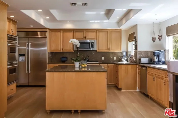 Tucked away on a secluded street south of the Boulevard, just moments from Ventura Blvd.’s restaurants, shops, and markets, this beautifully designed home was built in 2002 and offers a flexible, generously sized floor plan with approximately 3,442 square feet (per public record).The property features a total of five bedrooms and six bathrooms, including a separate guest apartment with its own private entrance, living room, bathroom, and kitchenette ideal for guests, extended family, or a home office.The light and bright living room opens to both the backyard and the kitchen, creating a seamless flow. The eat-in chef’s kitchen boasts stainless steel appliances, dual standard-sized ovens, granite countertops, wood cabinetry, a center island, and detailed lighting, all with beautiful, tree-lined views.A gracious powder room and an ample dining room with a fireplace, floor-to-ceiling sliding doors, a balcony, and a hand-troweled plaster wall with a dragon mural add character and elegance to the main level.The secluded backyard (approx. 1,000 sqft) offers privacy and tranquility with an outdoor fireplace, water fountain, and space wired for a spa. Additionally, a rooftop deck (approx. 800 sqft) provides 360-degree views of the surrounding hills and valley.Upstairs are three ensuite bedrooms, including the light-filled primary suite with treetop views, a fireplace, dual walk-in closets, and a spa-like bath with a jetted tub and oversized shower. A bar area and a convenient upstairs laundry room complete the upper level.Additional features include a three-car garage, an off-street uncovered parking space for the guest apartment, and a residential elevator. With its flexible and spacious layout, this home is perfect for entertaining privately nestled yet just moments from everything.