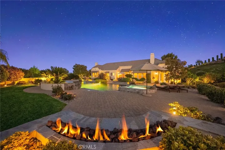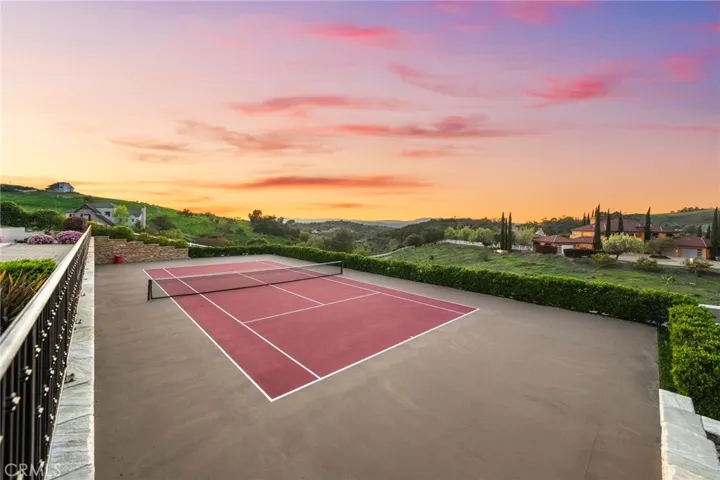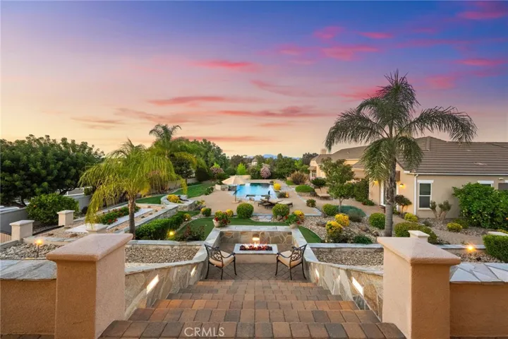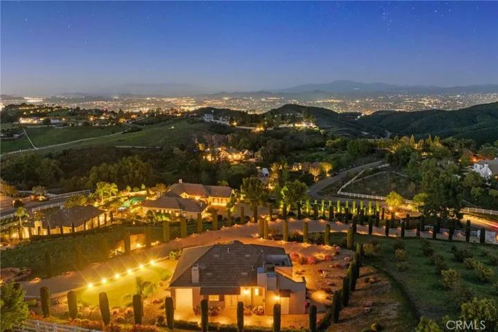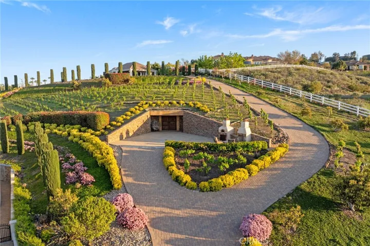 One-of-a-kind estate located just 5 minutes from the charm & culture of Old Town Temecula. Set behind 3 private gated entrances, this sprawling 4.19 acre compound features 3 separate single-story residences & an underground wine cellar all totaling approx. 6100 sq ft, masterfully positioned to capture breathtaking sunset views across rolling hills. The grounds truly set this estate apart; meticulously manicured landscapes framed by stately Italian cypress trees create an outdoor setting unlike any other. A dramatic stone stairway leads from the main home to the elevated studio residence. Entertain w/ ease and elegance w/resort style amenities; sparkling pool, two separate spas, water features, outdoor fireplaces, 2 putting greens, a sports court, & a post-tensioned tennis court w/ breathtaking views. Plus 2 built-in BBQ islands & pizza oven. Approx. 30,000 sq ft of stone pavers weave through the property. The main residence is approx. 3,275 sq ft w/ travertine flooring & architectural arches. It features 3 bedrooms, office, & 3.5 baths. The gourmet kitchen complete with granite countertops, 2 sinks, stainless steel appliances, built-in refrigerator, walk-in pantry, wine fridge, butler’s pantry, & bar seating-all flowing seamlessly into the family room w/ views of the pool & gardens. The primary suite offers a private retreat w/ its own fireplace & French doors leading to the amazing pool & spa. The guest house offers approx. 1,600 sq ft of luxury living w/ 2 bdrms, 2 baths, a chef’s kitchen, & fully retractable glass doors opening to commanding views of the surrounding countryside. At the estate’s highest point, the studio offers approx. 600 sq ft of open-concept living, complete with an elevated desk area, curved wine bar, a built-in spa, putting green, rooftop lounge, ATV-sized garage, & unmatched panoramic vistas. A 600 sq ft stand-alone reinforced concrete wine cellar is the perfect sanctuary for wine-making enthusiasts – complemented by approx. 1,000 wine grapevines and 21 table grapevines, as well as approx. 100 avocado trees, and various fruit trees. Additional features include upgraded mahogany garage doors, extensive landscape lighting, whole house & outdoor sound systems, multiple whole-house fans for year-round comfort, & a comprehensive security system. Perfect for a multigenerational compound, vineyard retreat, or entertainer’s paradise, this Temecula estate redefines California luxury living with a setting that must be seen to be believed.