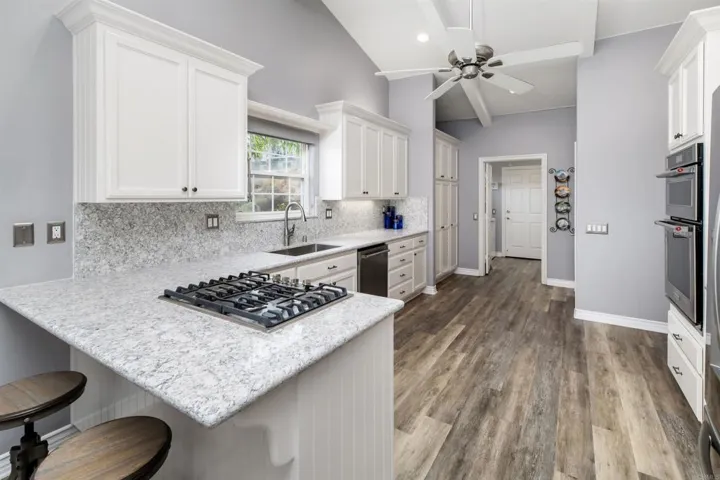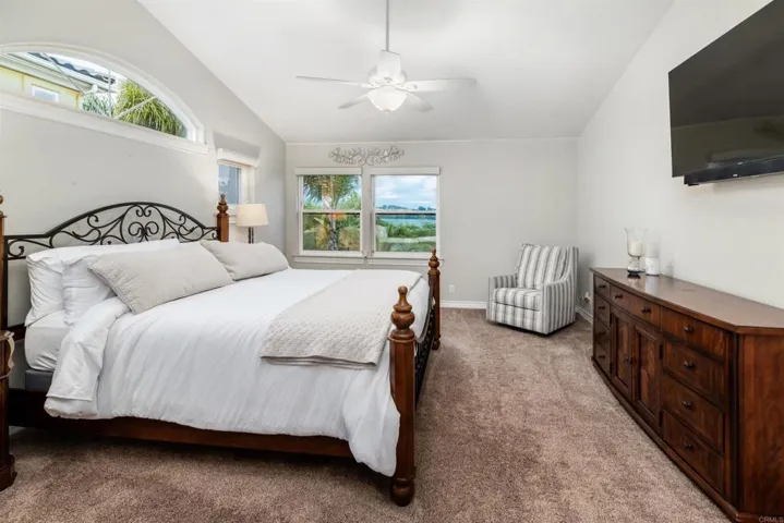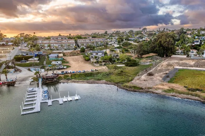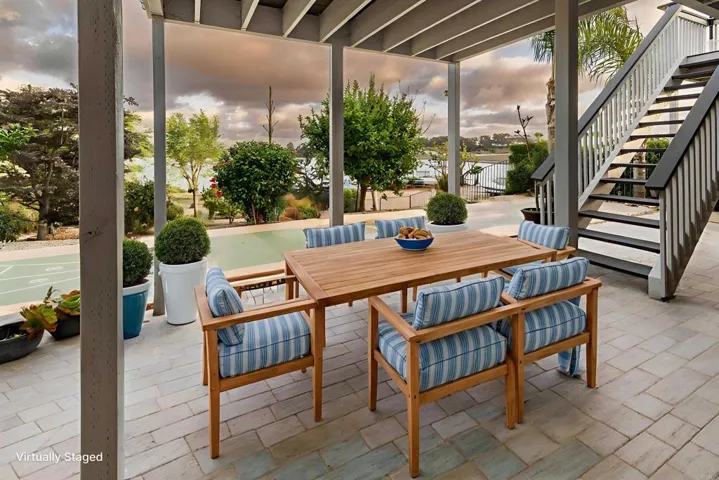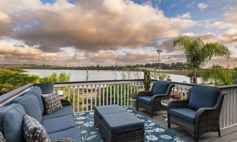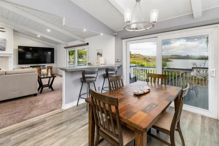 An amazing opportunity for an Airbnb or VRBO investment—or simply your own private waterfront retreat—this rarely available Carlsbad home is tucked away at the very end of a private drive shared with just one other home. This home opens up to sweeping, panoramic views of the Agua Hedionda Lagoon stretching all the way to the Pacific. Set on a nearly 20,000 sq ft lot, it offers exceptional privacy, breathtaking vistas from nearly every room, and direct access to the water—where kayaking, wakeboarding, and unforgettable sunsets can be part of everyday life. The flexible floor plan lives like a single story, with the primary suite located on the main level. Double front doors open to sweeping water views that immediately draw your eye across the open-concept living space. Vaulted wood-beamed ceilings and a stone fireplace add warmth and charm, while oversized sliders lead to a wraparound deck that stretches along the lagoon-facing side of the home—creating a seamless indoor/outdoor connection. The adjacent dining area with a second set of sliding glass doors, flows easily into a modern kitchen outfitted with quartz countertops, SS appliances, and a walk-in pantry. With natural light pouring in, the layout makes everything—from daily routines to entertaining—feel bright, open, and effortless. The main-level primary suite is peaceful and light-filled, with vaulted ceilings, large picture windows, and a beautifully refreshed ensuite featuring a walk-in shower, dual sinks, a vanity area, and a spacious walk-in closet. Downstairs, three guest bedrooms share a full bath and connect to a large, lounge-style living area with direct backyard access—perfect for game nights, movie marathons, or relaxed gatherings. A separate bonus room with custom built-ins adds extra flexibility, whether you need creative space or extra storage. Outside, the backyard is designed to take full advantage of the setting. A spacious stamped concrete patio offers plenty of room to relax or dine outdoors, while a built-in shuffleboard court brings a playful touch. Meandering garden paths wind through native plants, colorful blooms, and mature trees, gently guiding you toward the water’s edge—all framed by breathtaking sunset skies. With no HOA, a solar agreement already in place, and a location just minutes from Carlsbad Village, local beaches, and I-5, this is more than just a home—it’s a lifestyle. A rare chance to own a true waterfront retreat, where every day feels like a breath of fresh air.